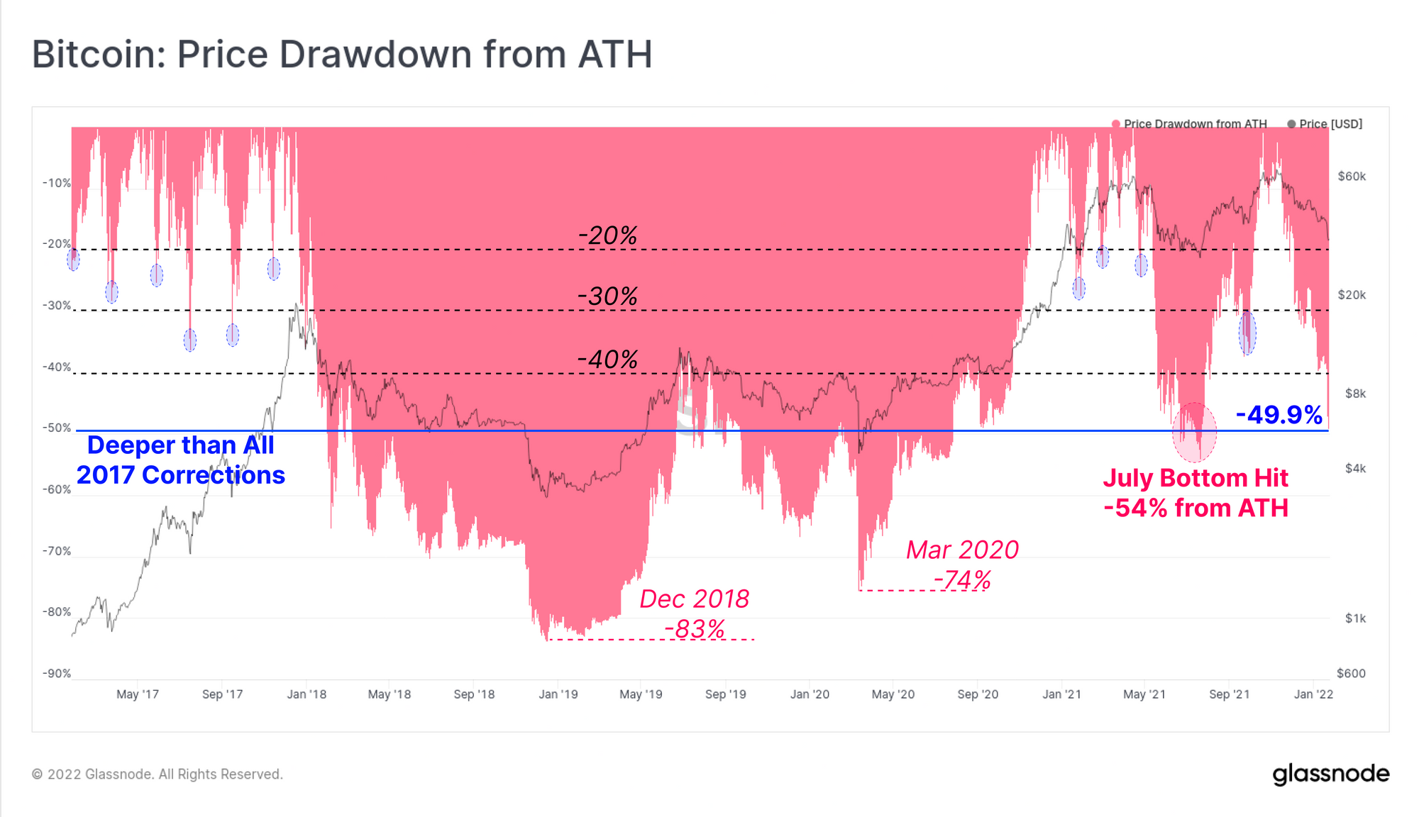At the weekly low, Bitcoin prices were just shy of being cut in half from the ATH, reaching a total drawdown of 49.9%. This is now the second worst sell-off since the 2018-20 bear market, eclipsed only by July 2021, where the market fell -54% from the highs set in April.
