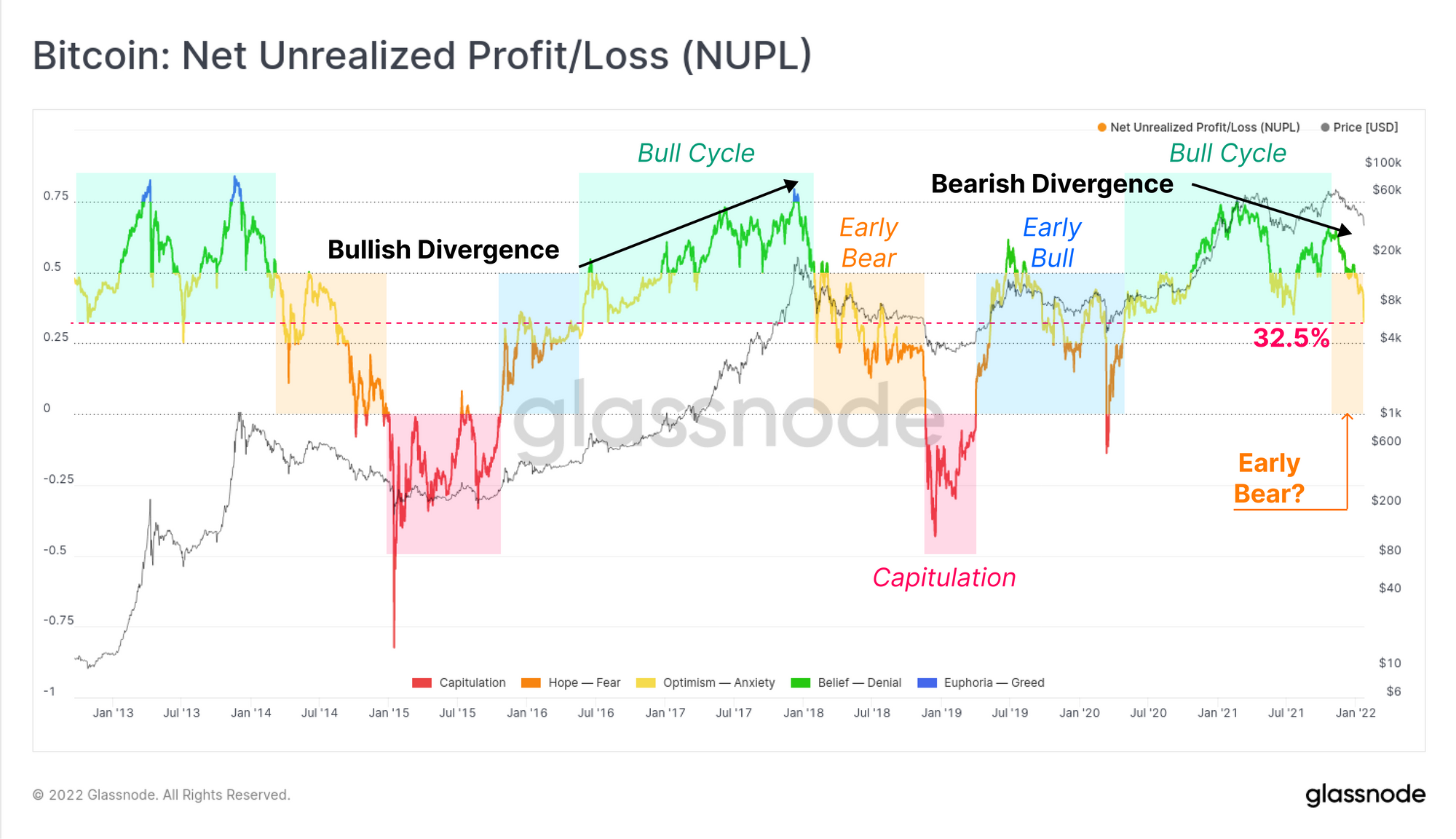 The Net Unrealised Profit/Loss (NUPL) metric presents the overall market profitability as a proportion of market cap. NUPL is currently trading at 0.325 which indicates that an equivalent to 32.5% of the Bitcoin market cap is held as an unrealised profit.