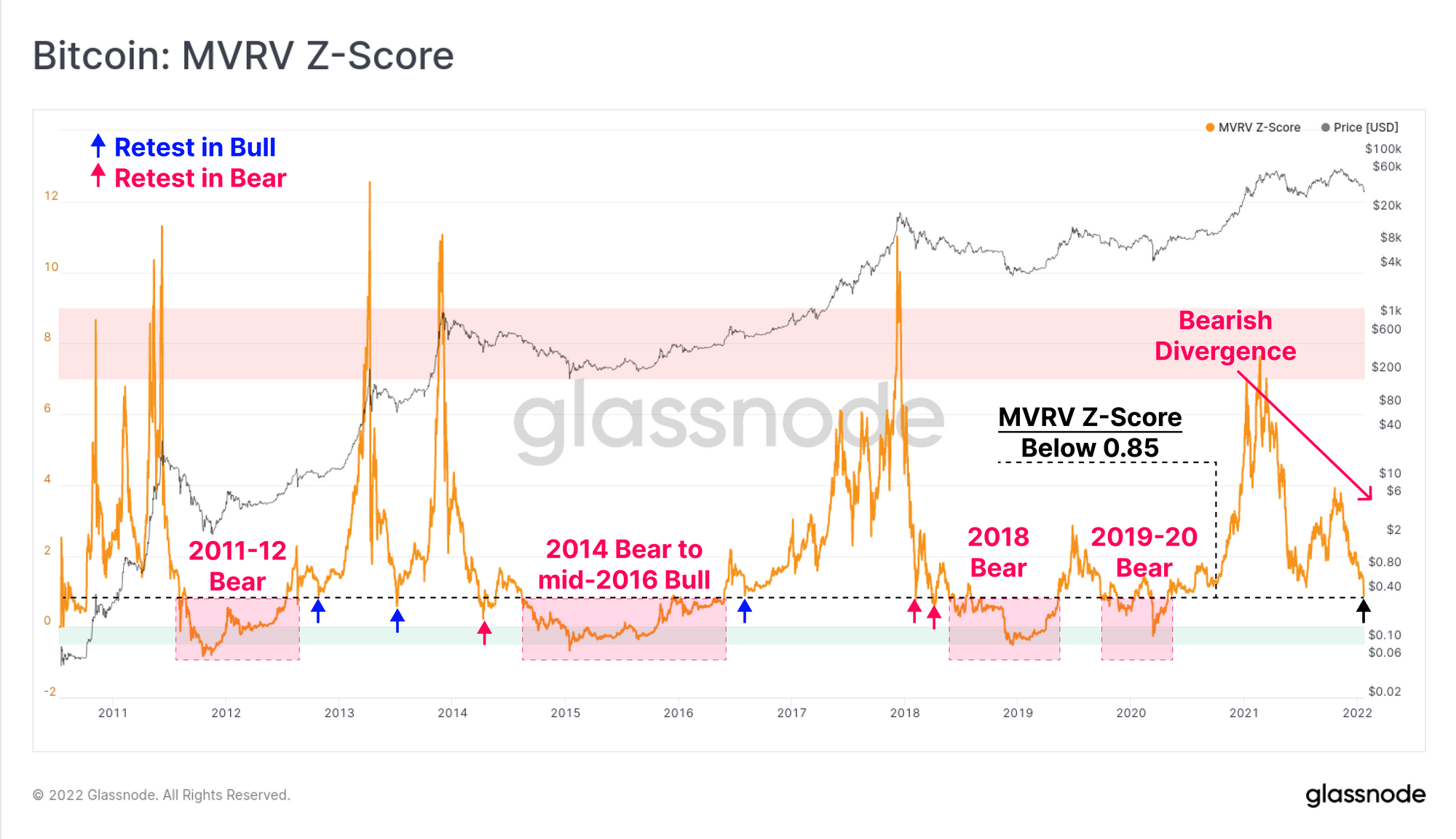 - Mid-to-late bear markets (red boxes) where MVRV-Z trades below 0.85, signifying a period of very poor profitability, low sentiment, and sustained investor loses.