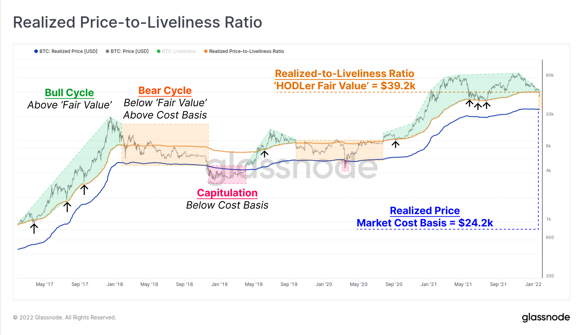A recently developed on-chain tool is the Realised-to-Liveliness Ratio (RTLR) by Dor Shahar, who a modified the Realised Price using Liveliness in the denominator. It can be though of as a 'Hodler fair value' model, and is designed to amplify, or discount the Realised Price as follows: