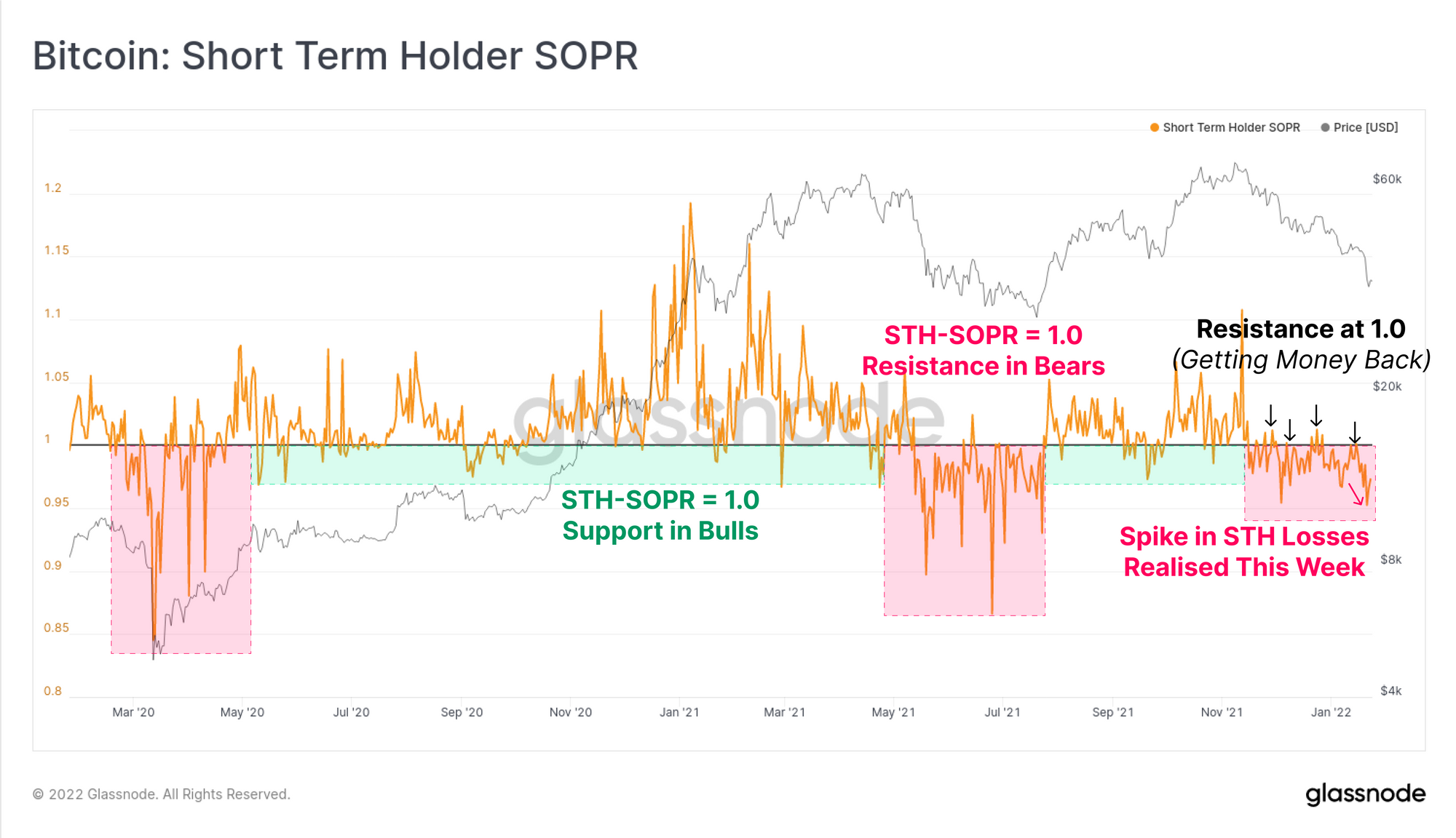 The STH-SOPR metric has accelerated downwards this week, after finding resistance at a value of 1.0 throughout this drawdown. Psychologically, this suggests that recent buyers are taking exits at, or below their cost basis to 'get their money back', creating sell-side pressure and resistance. Lower values indicate heavier losses are taken by STHs, who in this instance are disproportionately top buyers.