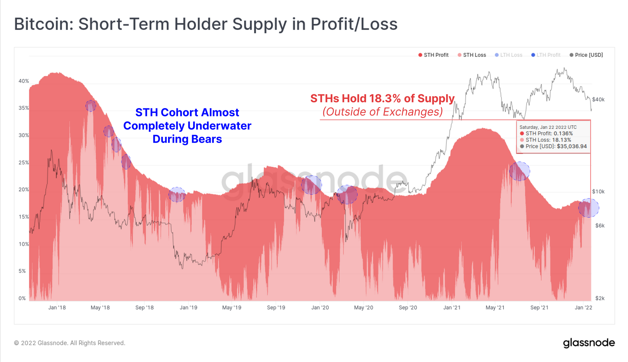 Assessing the supply dynamics, we can see that Short-Term Holders are currently in possession of approximately 18.3% of the coin supply (excluding coins held by exchanges). The light red area in the chart below represent the proportion that are currently held at a loss, and as of this week, almost the entire STH supply is underwater.