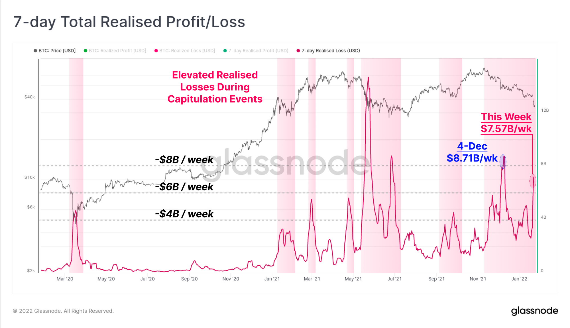 Over the last 7-day period, the total sum of realised losses has now exceeded $7.57 Billion, again in a similar ballpark to major capitulation events over the past 12 months. It can be seen in the chart below that large realised loss events typically correlate with local market lows, as investors who bought the recent top capitulate, and stronger hands and traders drive the market into a relief rally.