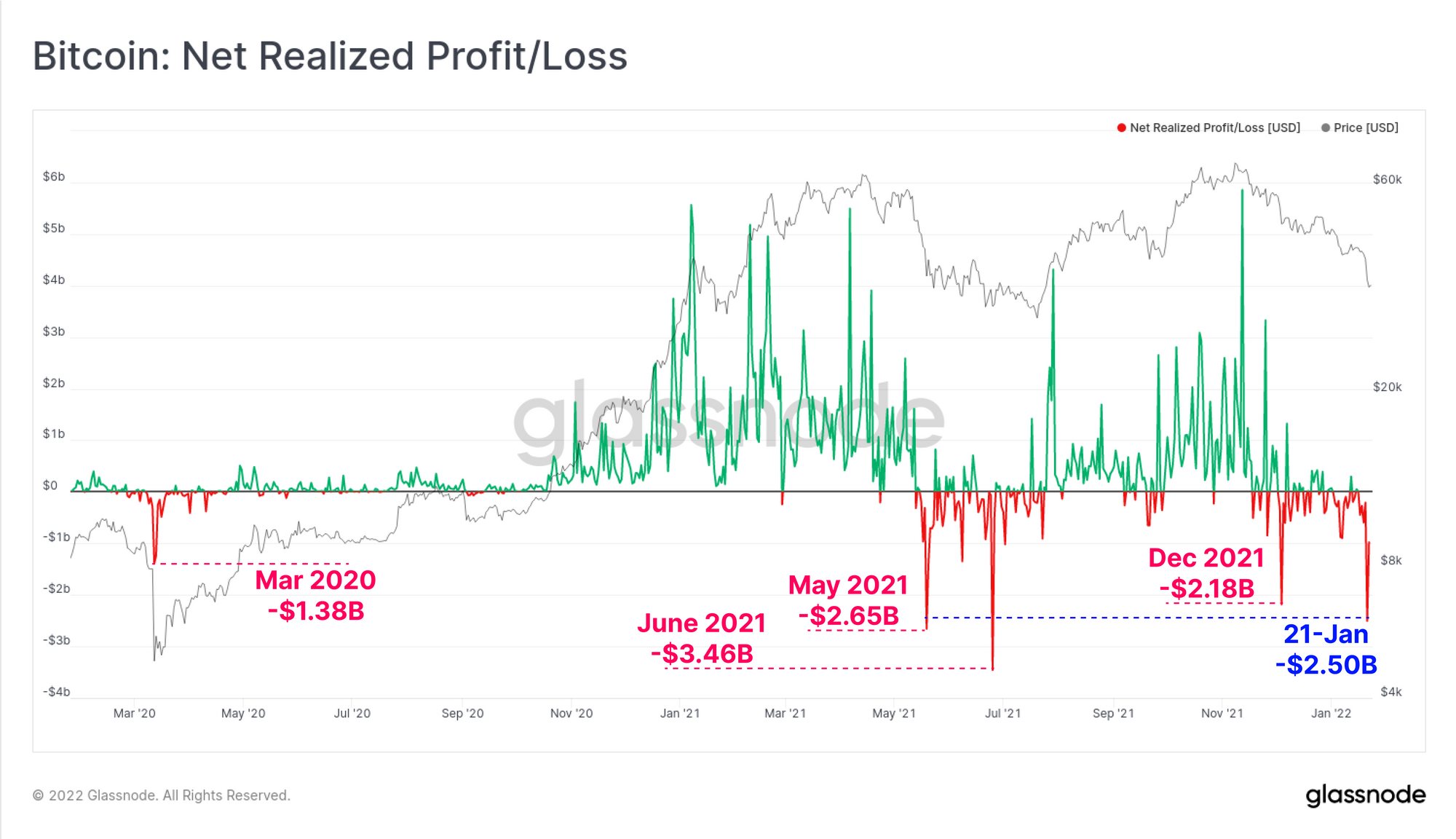 As the market traded down to the weekly lows on Saturday, over $2.5 Billion in net losses were realised, with investors spending coins held at a loss. This marks the largest capitulation event of this drawdown, and almost matches the $2.61 Billion net loss from May 2021 (read our analysis of that sell-off here).