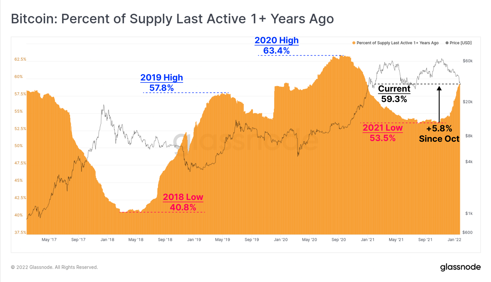 And finally, to close out our analysis for the week, we highlight that the total coin volume older than 1yr has been on a remarkable ascent since October. Over 59.3% of the circulating supply has now been dormant for over 1yr, increasing by 5.8% of circulating supply in the last three months.