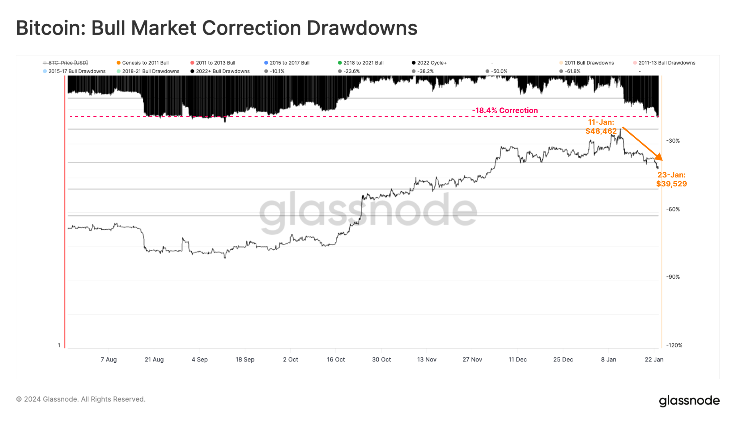 The digital asset markets experienced an uptick in speculation leading up to the Bitcoin ETF approvals, with a general sell-the-news event playing out over the following days. As we discussed in our last edition (WoC-03), the market had arguably priced the event to near perfection. Bitcoin prices have since fallen by -18%, dropping as low as $39.5k as of the time of writing.