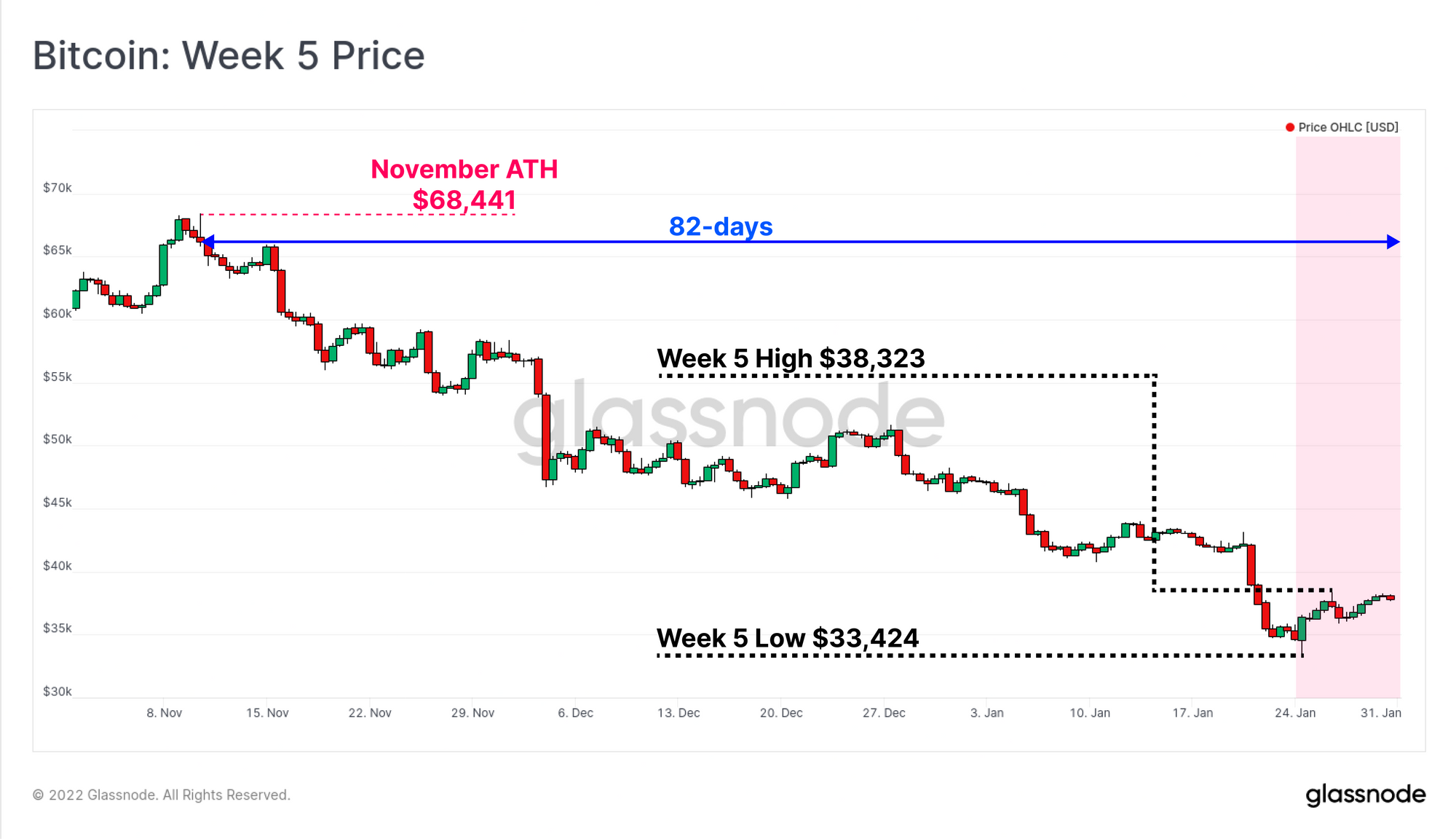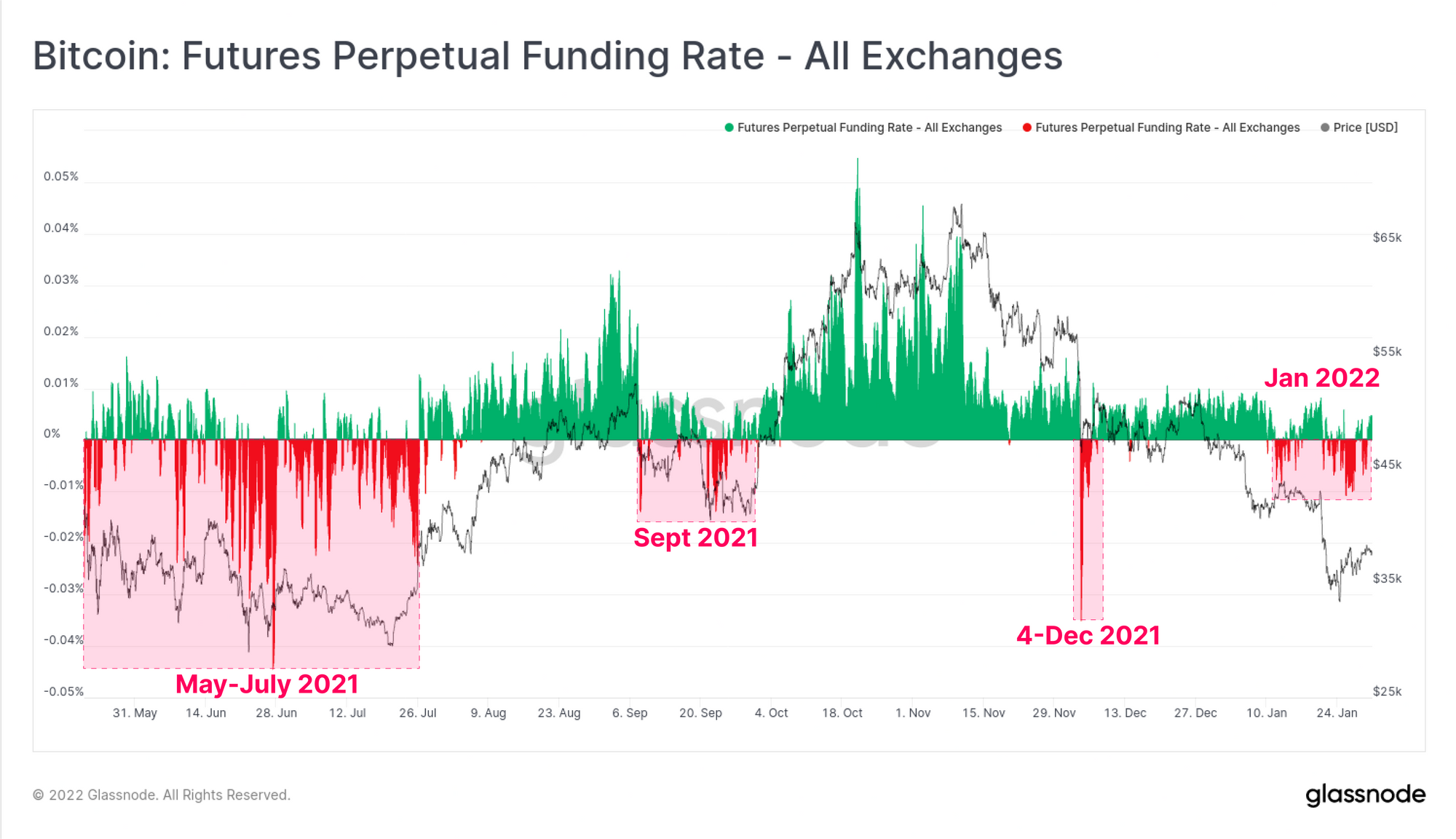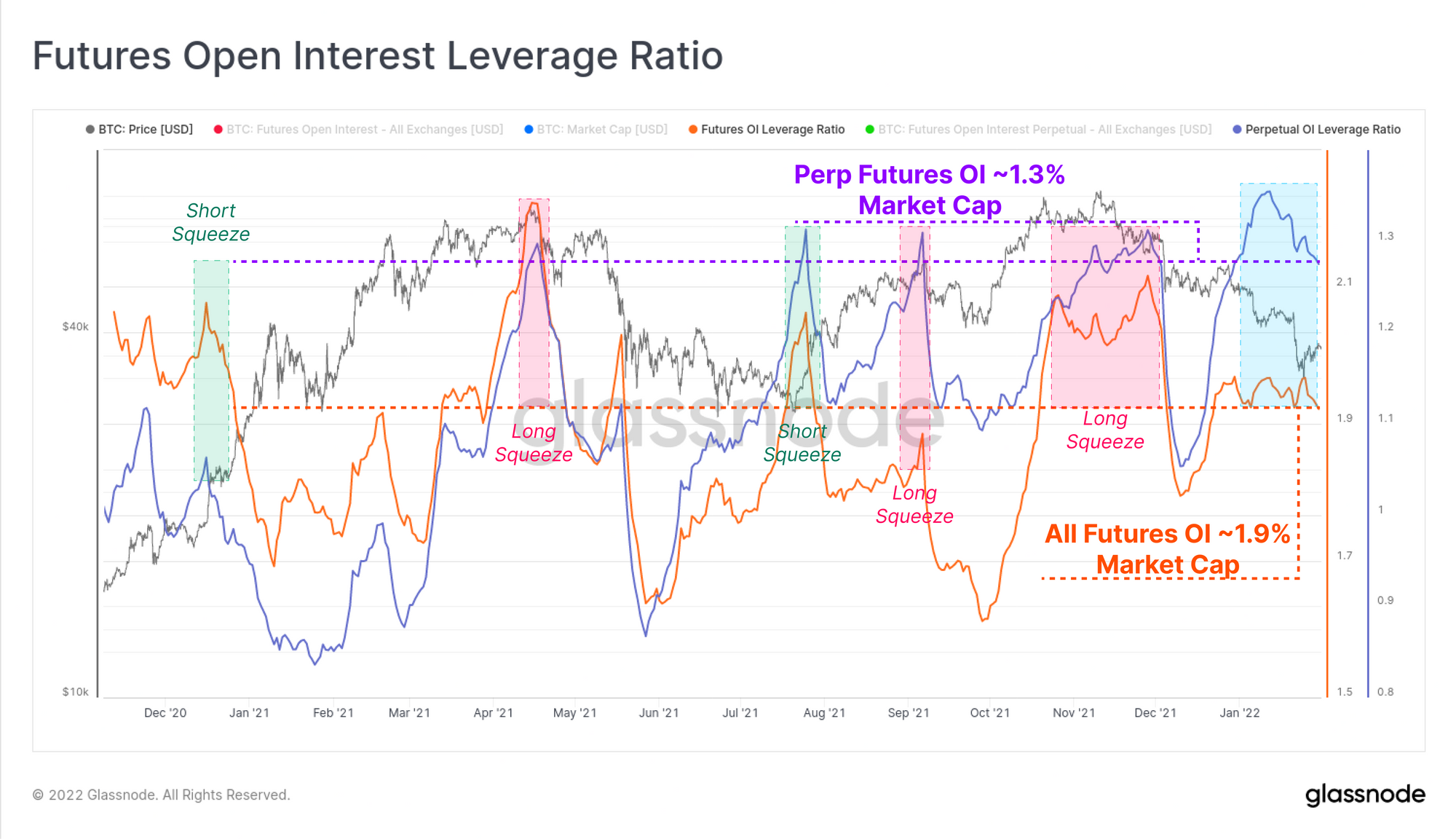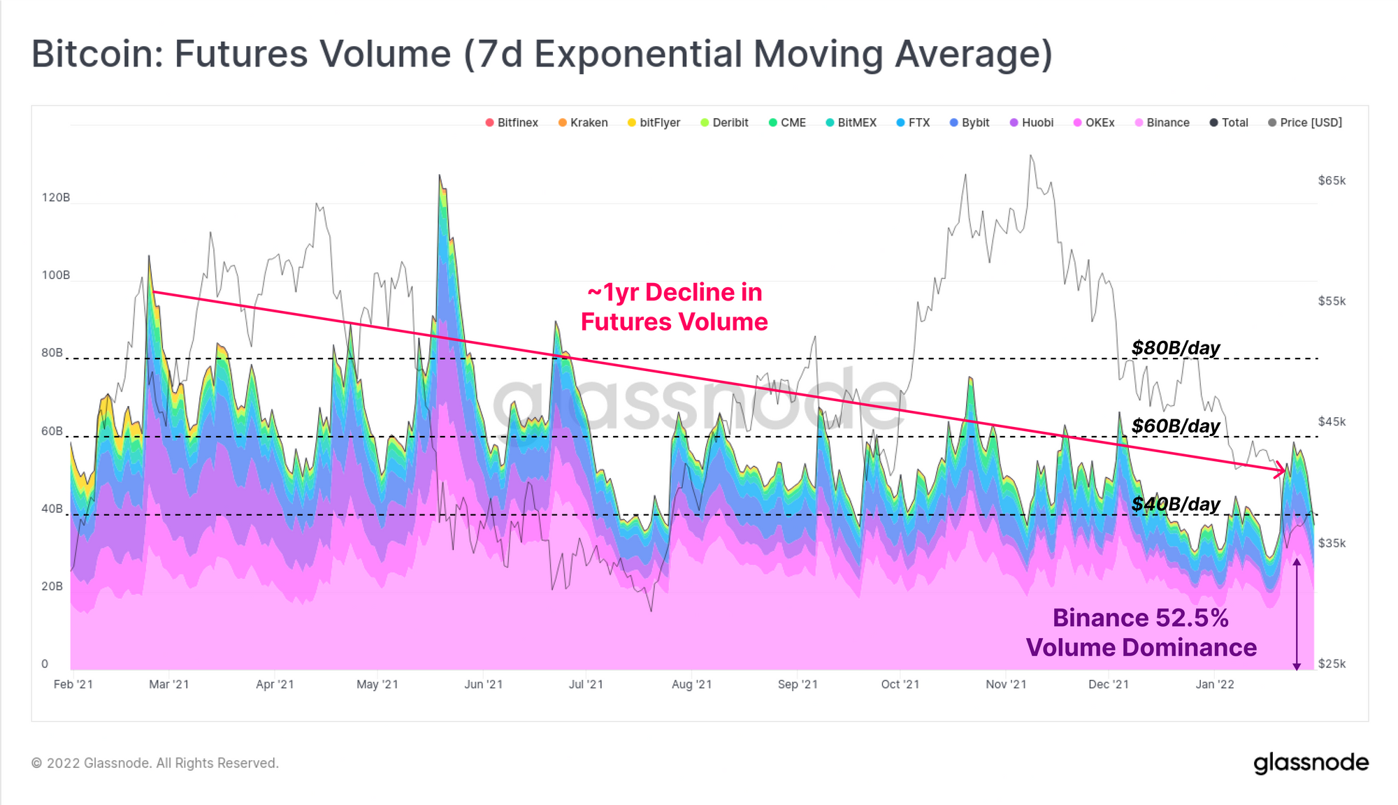 Over the course of 2021, trading volumes in futures markets have been in macro decline, falling over 50% from $80B/day in March 2021, to under $40B/day in January 2022. As is commonplace during high volatility events, this week's sell-off to $33k was met with a significant uplift in trading volume, hitting just under $60B/day.