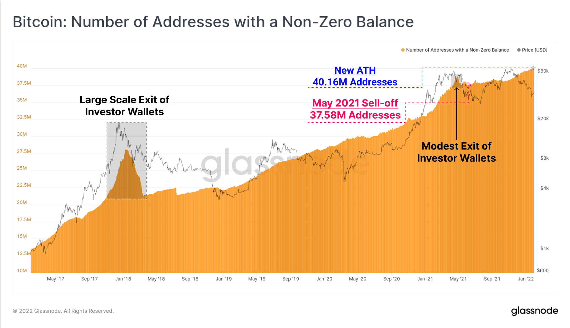 The current upwards trajectory of non-zero wallet counts appears to be largely unaffected by the last three months of depressed prices, sporting similarities to the mini-bear of 2019, and hitting a new ATH of 40.16M addresses.
