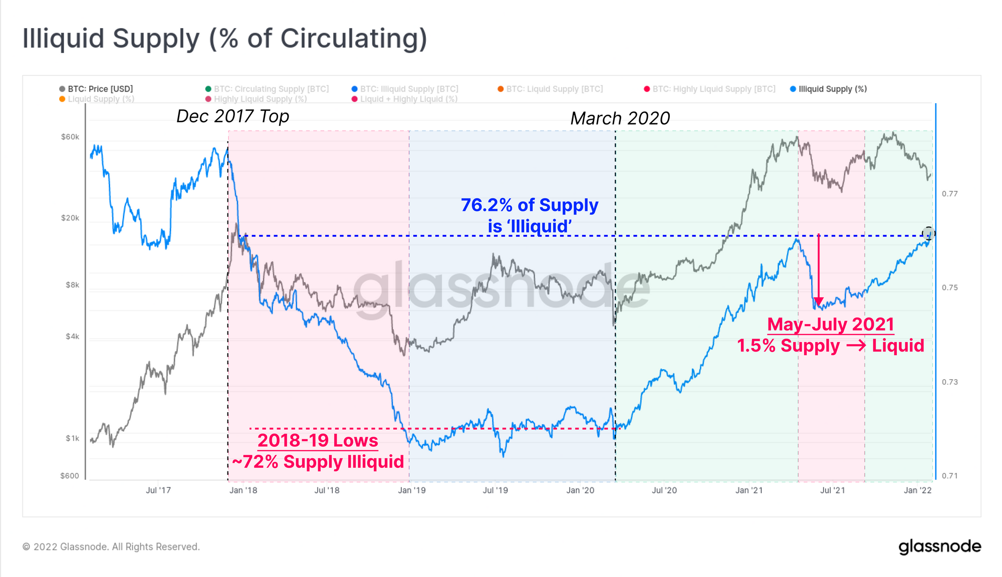 - Bearish periods (red zones) such as 2018 and May-July 2021 are punctuated by large declines in Illiquid supply. This means an large volume of coins were spent out of cold storage, and must be subsequently absorbed by new buy side demand.