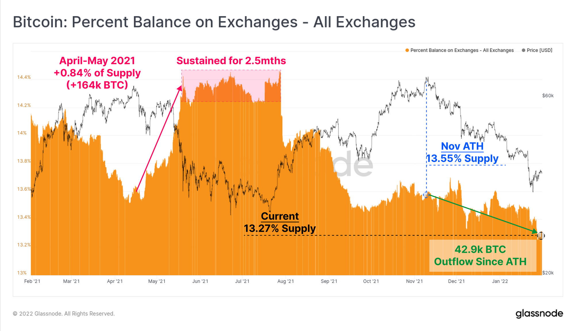 As a result, total exchange reserves have declined to multi-year lows, reaching 13.27% of the circulating supply. It is important to note that this is very different to the market reaction observed in the May-July 2021 drawdown: