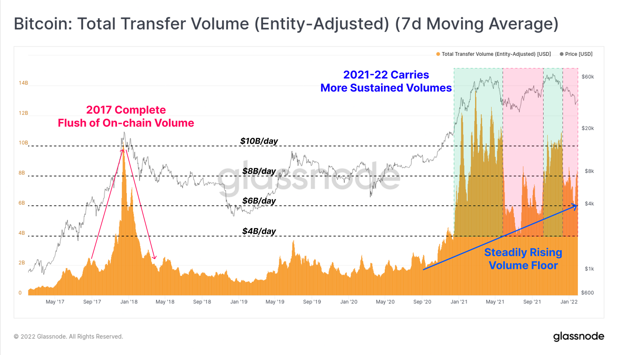 During both of the aforementioned 50%+ drawdowns, settlement volumes declined significantly from the peaks. However, the floor value has continued to grow, even during bearish trends (red zones). This speaks to a more sustained, and even growing utility of Bitcoin as the market cap, holder base, and value stored increases.