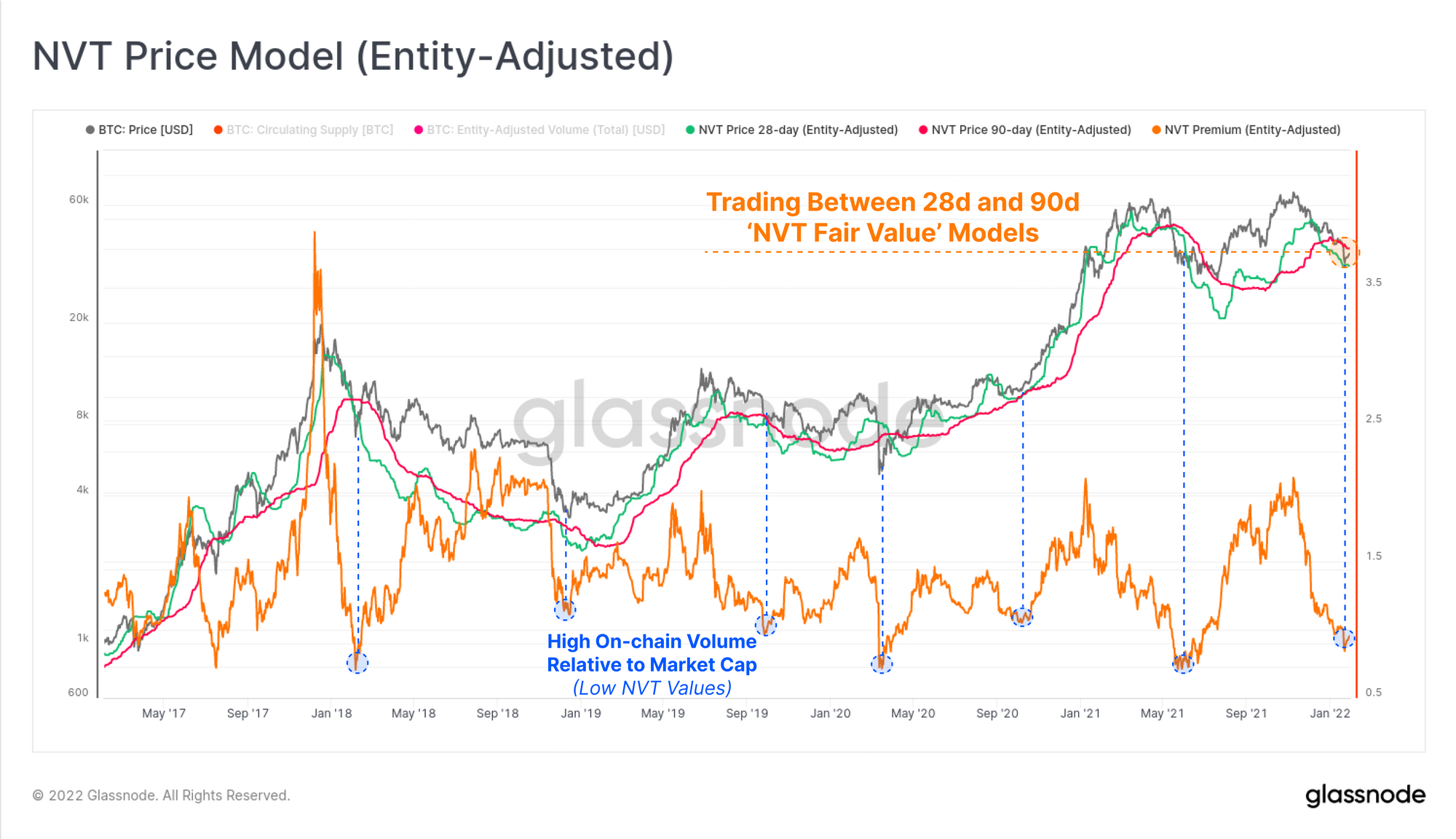 Taking a ratio of price and the 90-day NVT price gives an 'NVT Premium', which is currently trading at lows that are historically considered undervalued. Previous instances where settlement volumes have been this high relative to the market cap have preceded strong bullish impulses in bear markets, or at macro market bottoms such as Dec 2018, and Mar 2020.