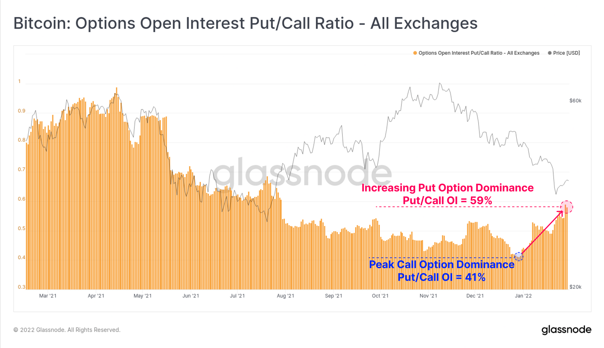 The Bitcoin market has continued to slide lower, reaching $33,424 on Monday, the lowest traded price since July 2021. Prices have now been in an established downtrend for 82-days, and negative sentiment has spiked higher, particularly across derivatives markets. Funding rates for perpetual swaps traded into negative territory, and we have seen a notable reversal in options markets, where put option volumes have increased markedly.