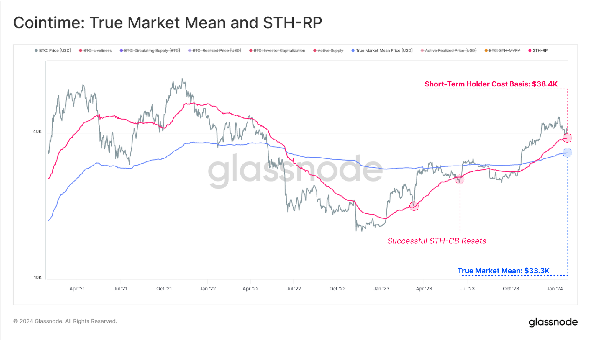 - 🔵 True Market Mean Price ($33.3k), a cost basis model for active investors.