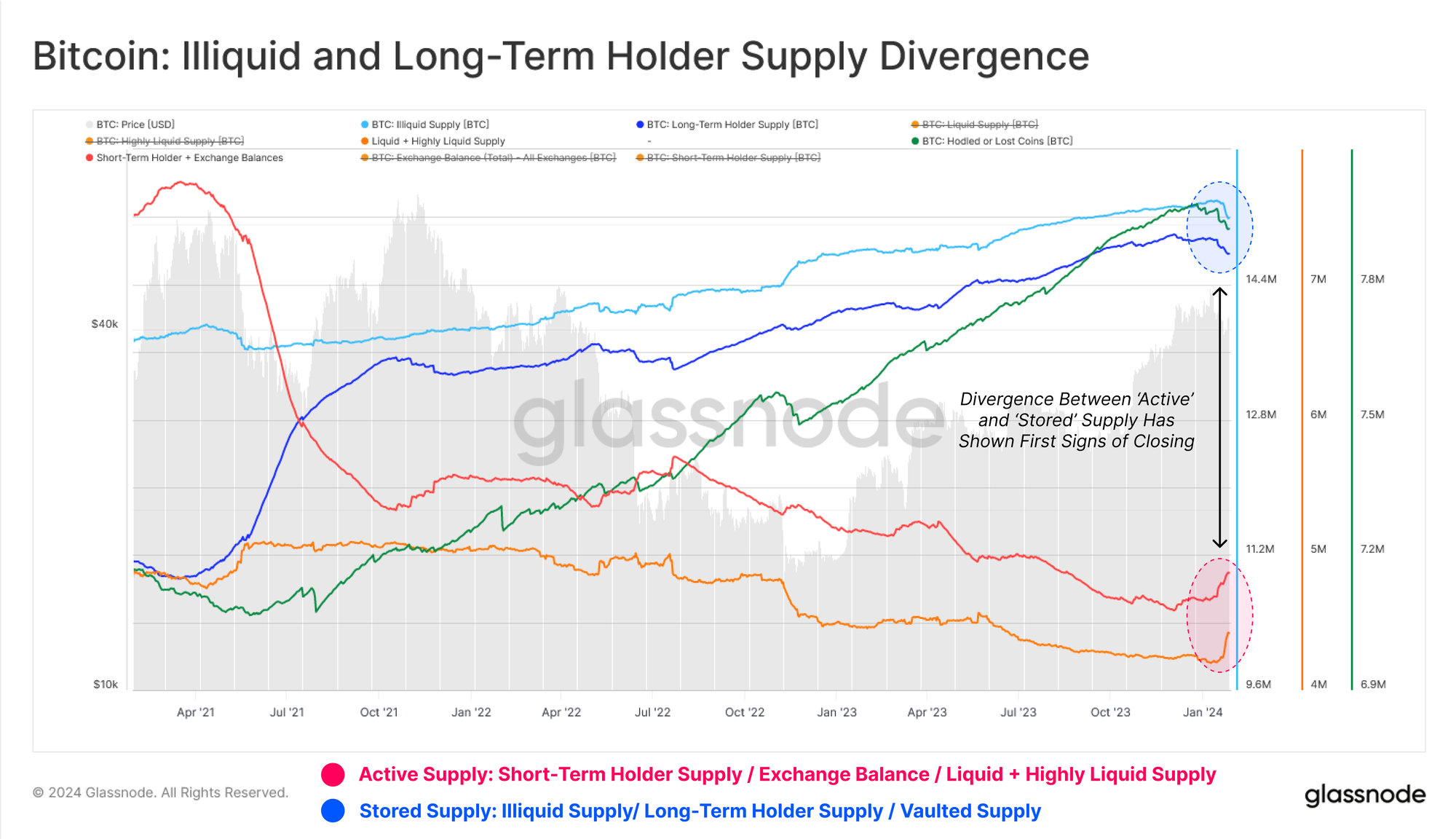 This year we see the first signs of a potential closing of this divergence, a notable increase across all measures of “Active Supply”. This provides confluence with the aforementioned uptick in older coin spending.