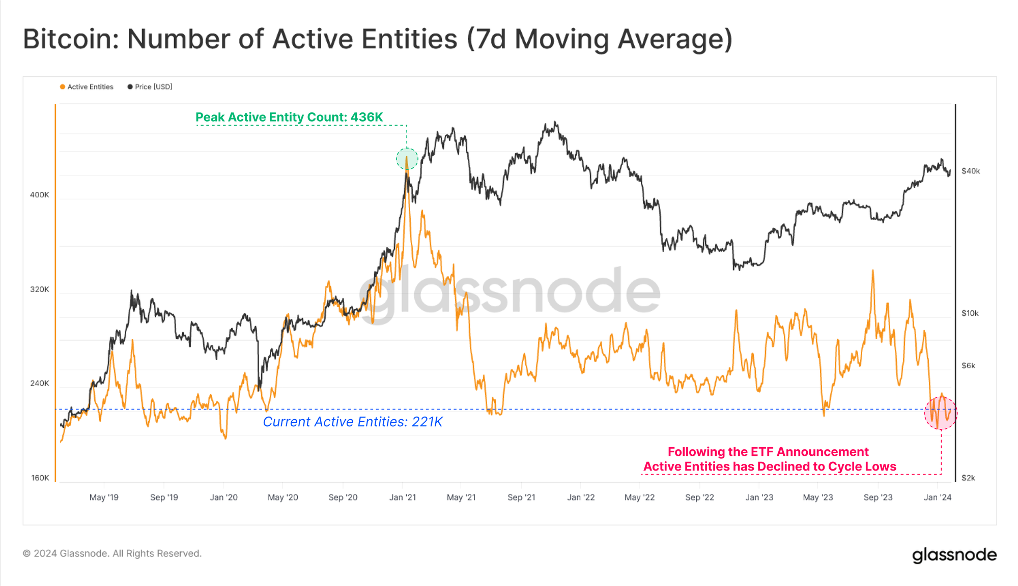 Assessing on-chain activity for Bitcoin can provide great insights into the health, adoption, and growth of the network. However, despite strong price performance, a counter intuitive observation has emerged with the number of Active Entities declining to cycle lows of 219K per day.
