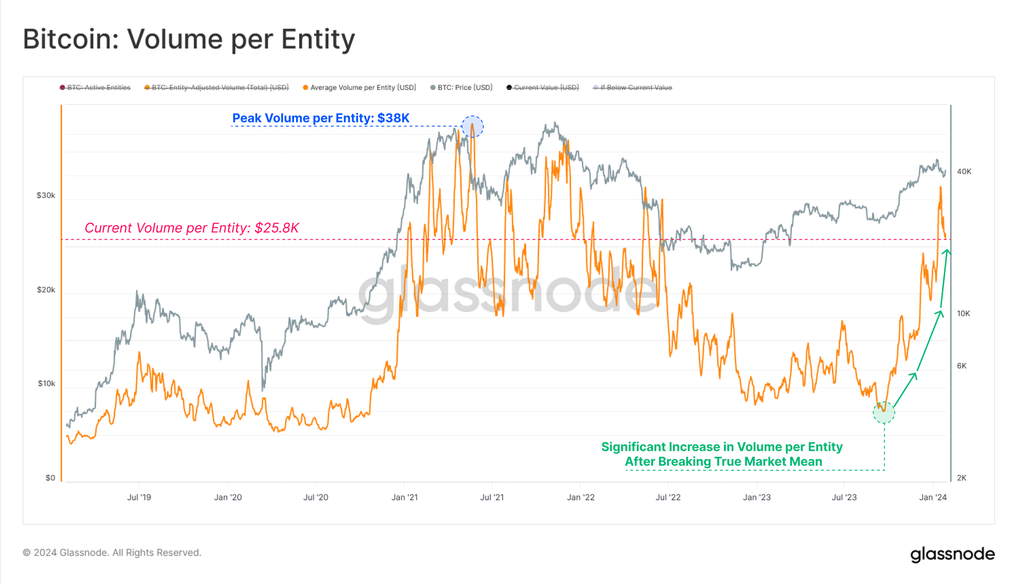 Transfer volumes on the other hand remains extremely robust with around $7.7B/day in economic volume processed. This divergence between ‘active entities’, and increasing transfer volumes highlights an elevated presence of large size entities active in the market, with the average Volume per Entity soaring to value of $26.3k/transaction.