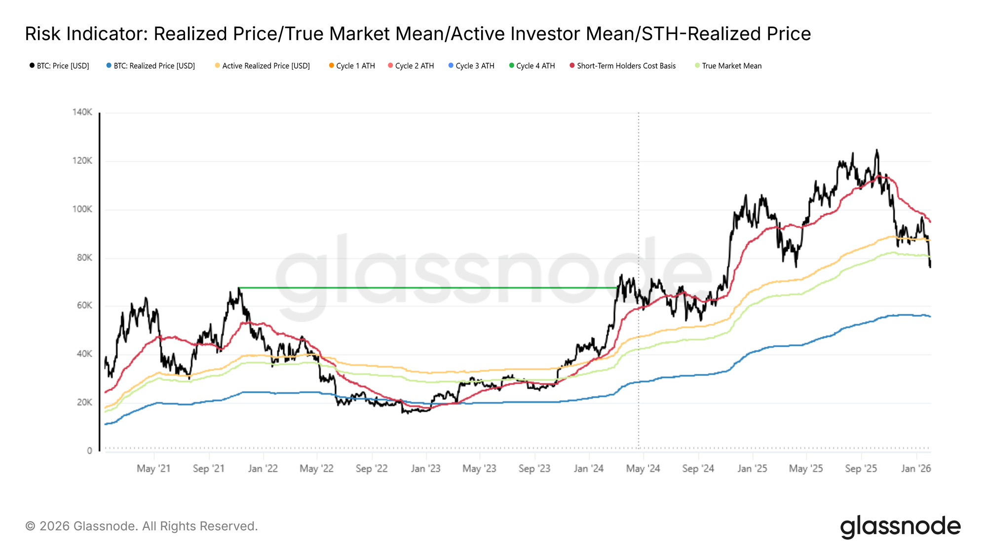 - BTC has confirmed a decisive breakdown, with price slipping below True Market Mean and keeping market participants firmly on the defensive.