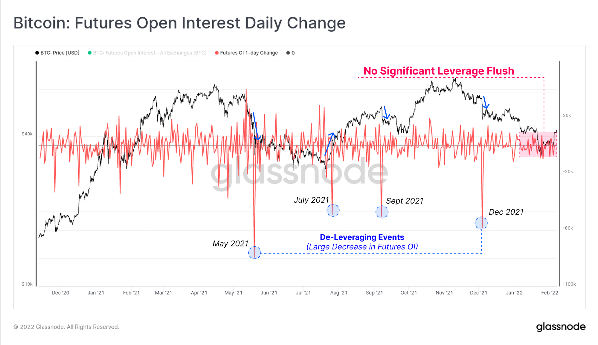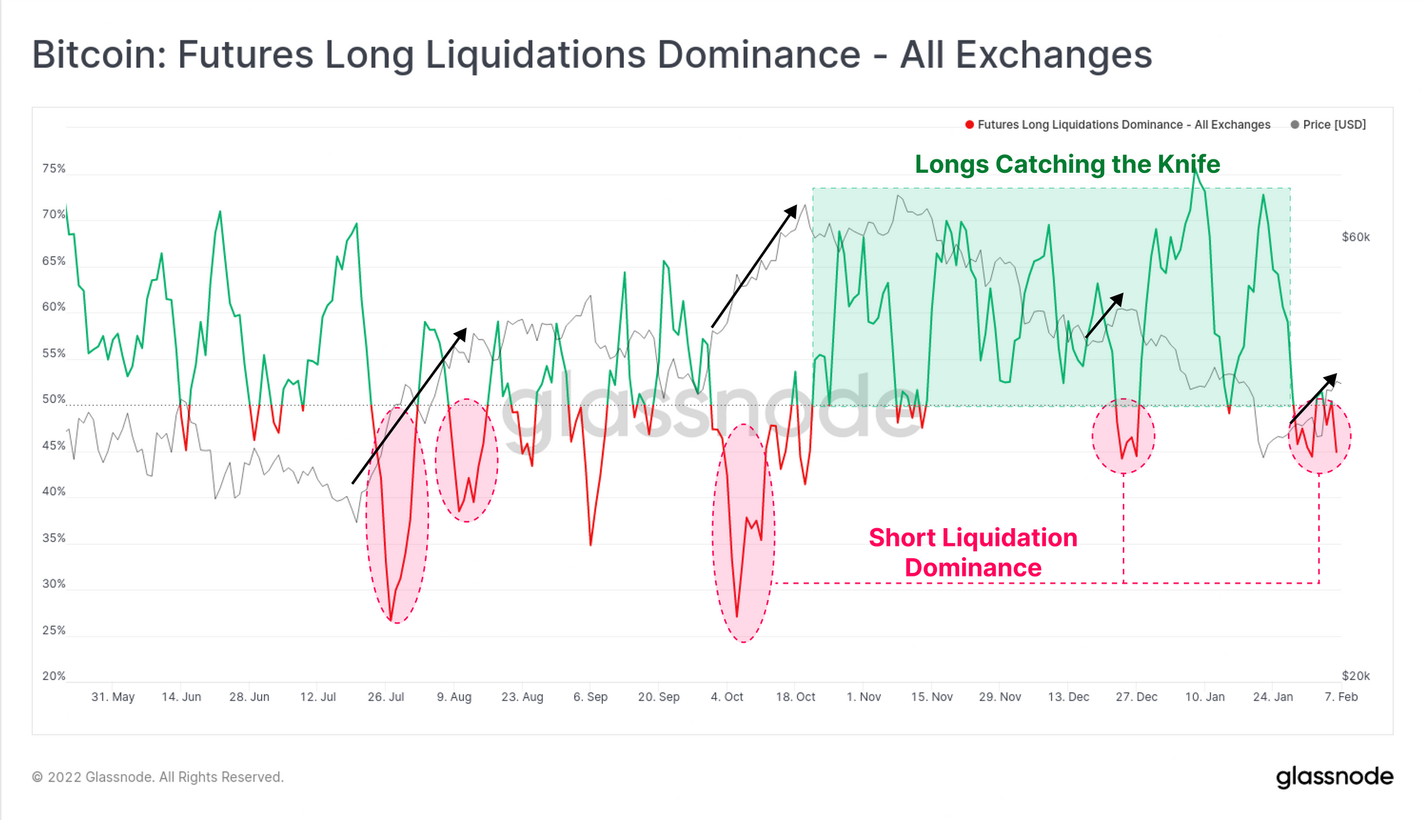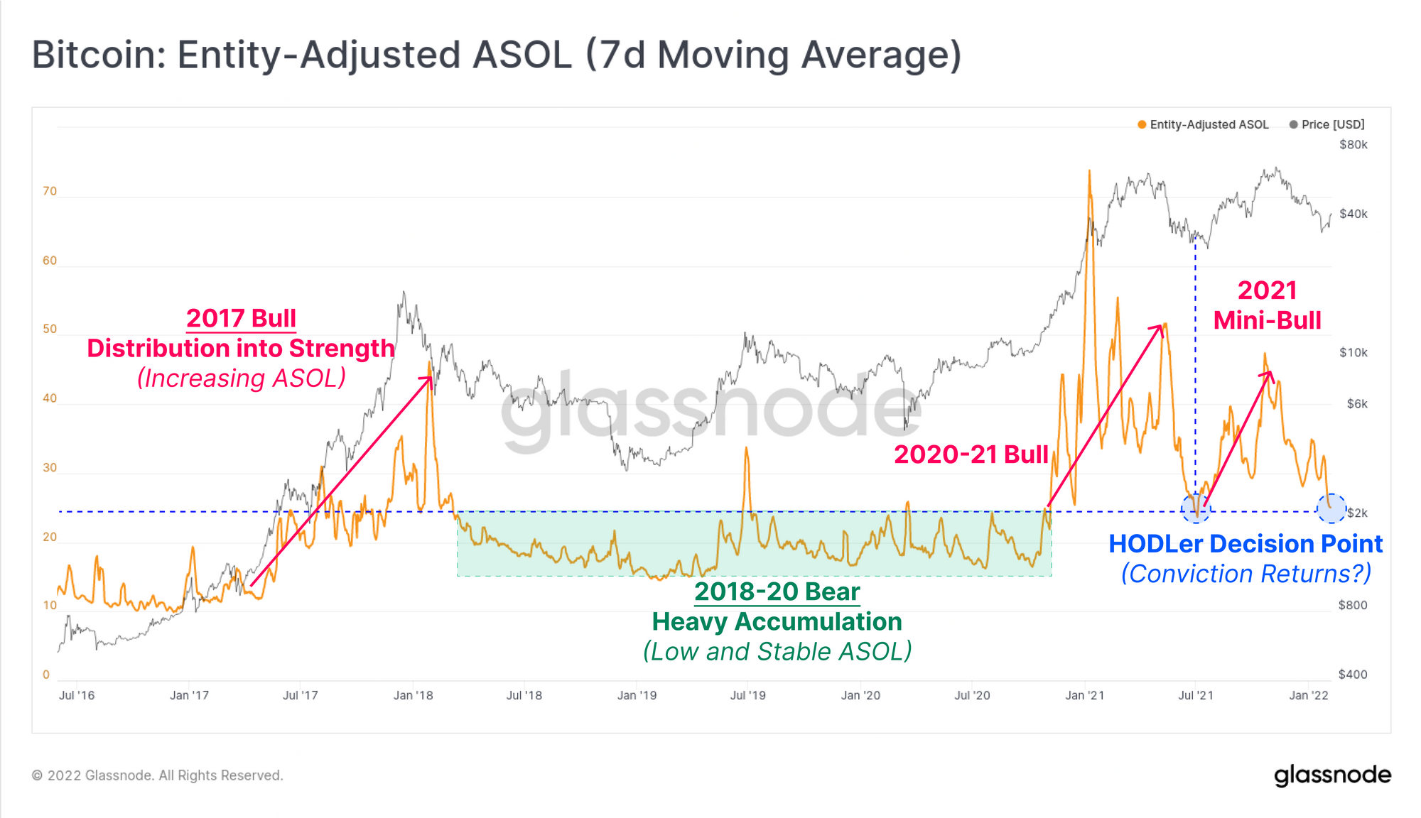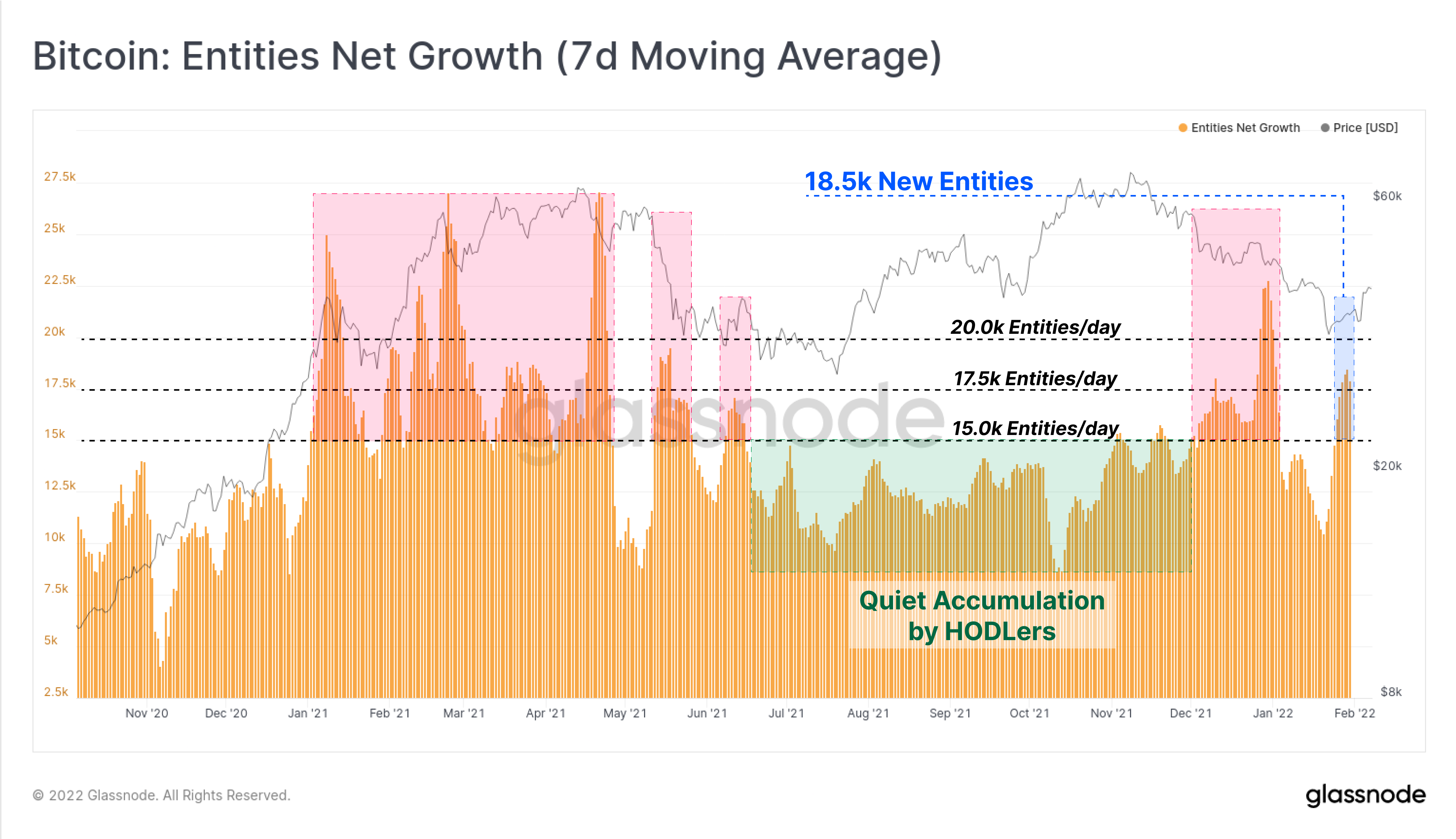 June to Dec 2021 was a period of quiet accumulation with a stable baseline of 12.5k net entities entering the network per day. As such, the recent spikes in Jan and Feb may suggest a tentative transition out of HODLer dominated accumulation, or at least a renewed interest in Bitcoin after trading down to more attractive entry prices.