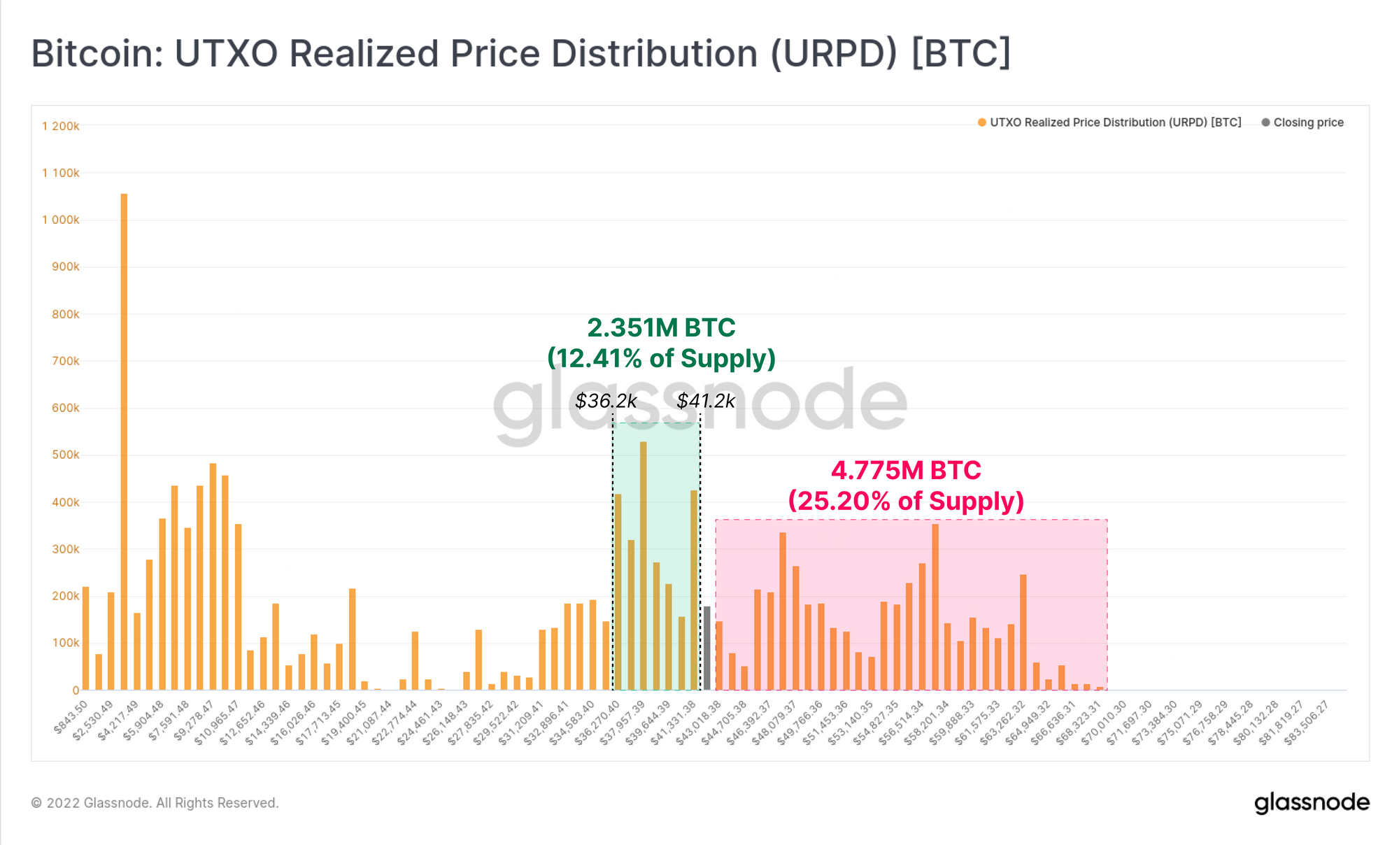 The URPD metric shows the distribution of realised prices for the current Bitcoin UTXO set. Here we can see that 2.351M BTC (12.41% of supply) have last transacted between $36.2k and $41.2k. Even with these coins being redistributed to lower realised values, the market remains top-heavy, with more than 25% of the circulating supply having last transacted at higher prices.