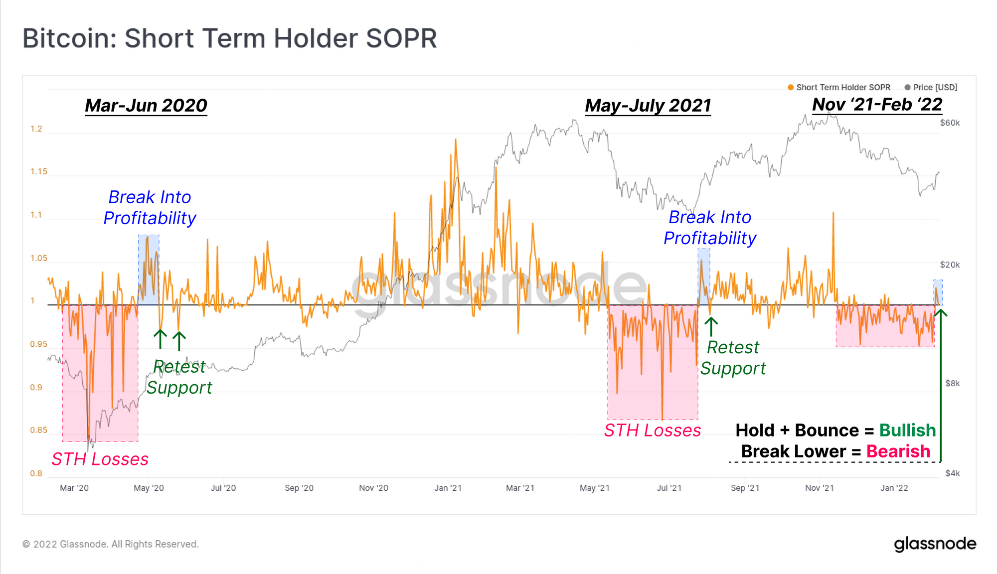 A similar STH-SOPR pattern can be seen in two instances since March 2020. After a long period of losses, the market managed to break into a bullish uptrend, with a STH-SOPR retest of 1.0 to confirm. Should we see STH-SOPR break higher again, it indicates renewed profitability and demand inflows are absorbing coins. Conversely, a break back below 1.0 would be a bearish indicator, and suggests there is insufficient demand to support sell-pressure from STHs.