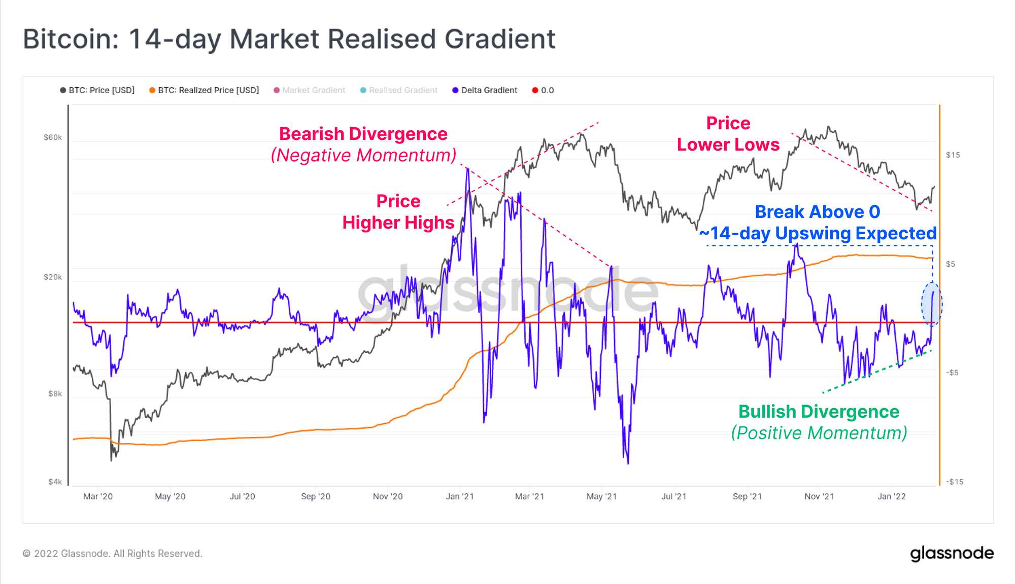 We can also see a fairly dramatic bullish divergence playing out on the 14-day Market-Realised Gradient (MRG) oscillator. This metric models the degree of momentum in market pricing relative to the natural capital inflows, captured in the Realised cap. General interpretation is as follows:
