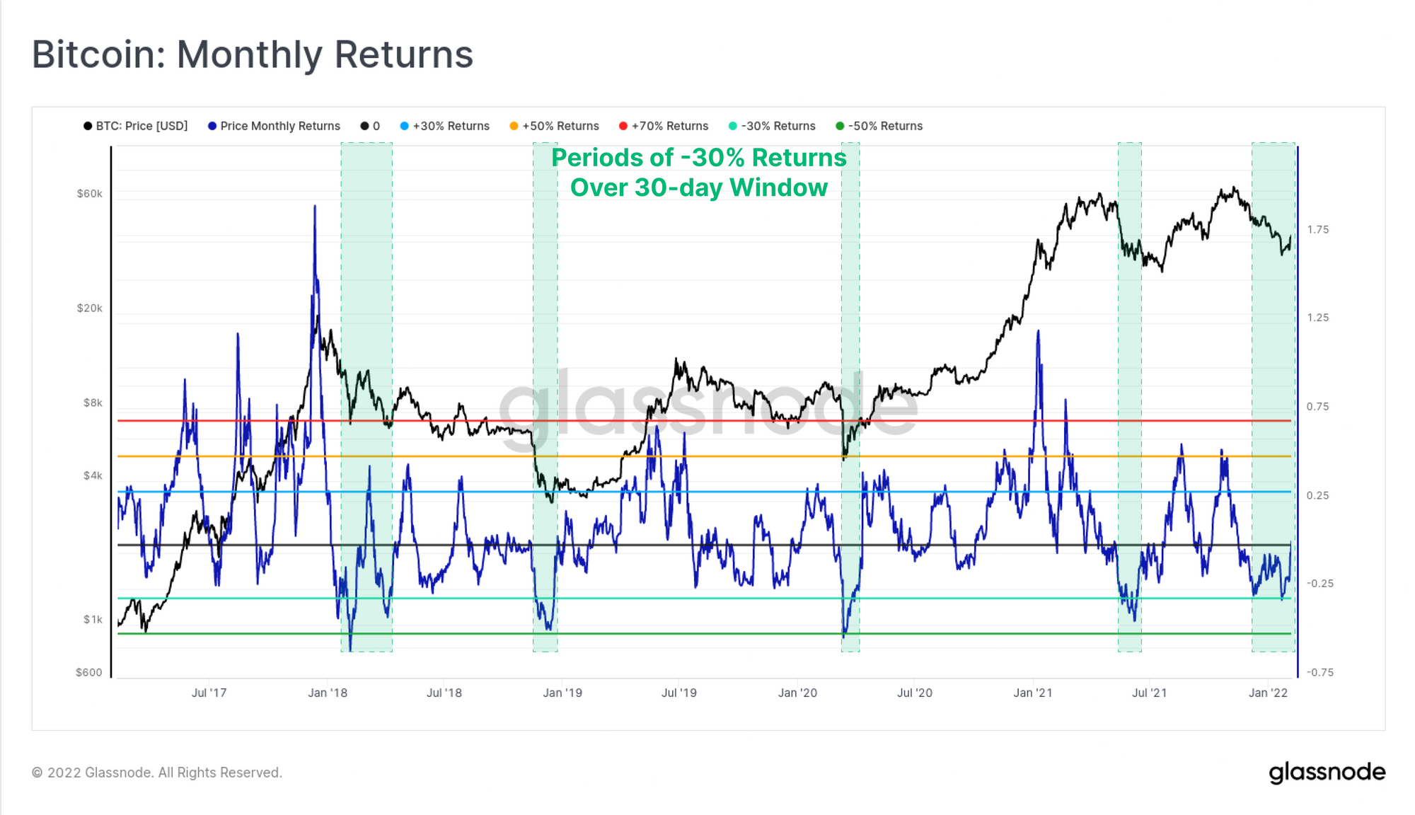 As the Bitcoin prices bounce from multi-month lows, we investigated the potential driving mechanisms, and evaluated the support provided by investors in the $30k-$40k range. The market lows of $33.5k set last week were associated with historical undervaluation across a range of metrics including the Mayer Multiple, RTLR, and the monthly return profile.