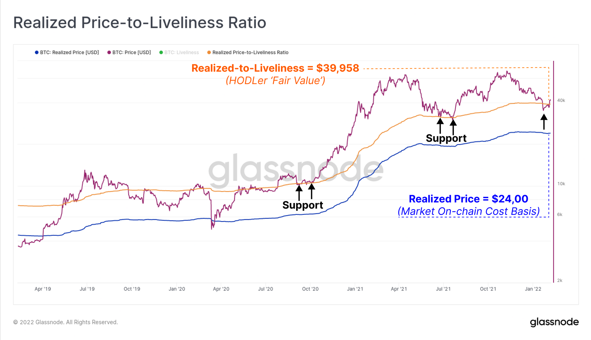 Another metric that reflects a 'fair value' is the Realised-to-Liveliness Ratio (RTLR) which is proposed to estimate the 'fair value' of Bitcoin as priced by the HODLer cohort. During periods of heavy coin dormancy, Liveliness declines, and the realised price is thus amplified when Liveliness is placed in the denominator (and vice-versa).