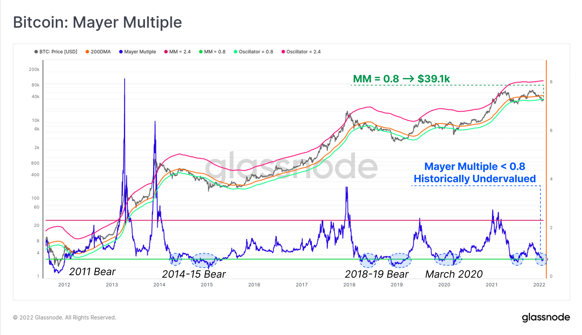 One of the simplest, but still very powerful tools for this is the Mayer Multiple, calculated as a ratio between price and the 200-day moving average. The 200DMA is widely observed as a long-term bull/bear indicator in technical analysis, and as such steep deviations below it can indicate a degree of undervaluation relative to a long-term mean. The Mayer Multiple traded below 0.8 this week, representing a 20%+ discount relative to the 200DMA. The price level representing a Mayer Multiple of 0.8 is $39.1k, which the market has now reclaimed (calculated as 0.8 x 200DMA).