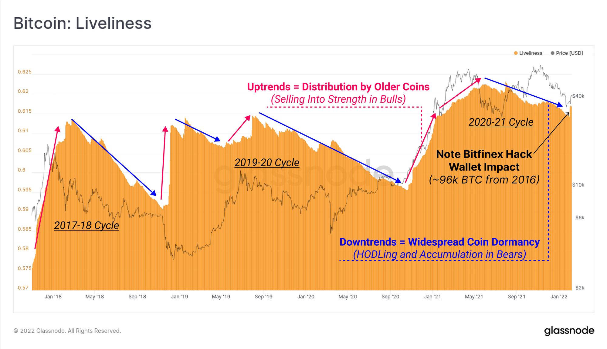 As noted above, a declining Liveliness metric indicates that across the entire coin supply, a greater volume of coins are dormant and accumulating lifespan (coin-days), compared to those being spent, destroying coin-days. This is typical of periods of HODLer accumulation, and is often synonymous with bear markets.