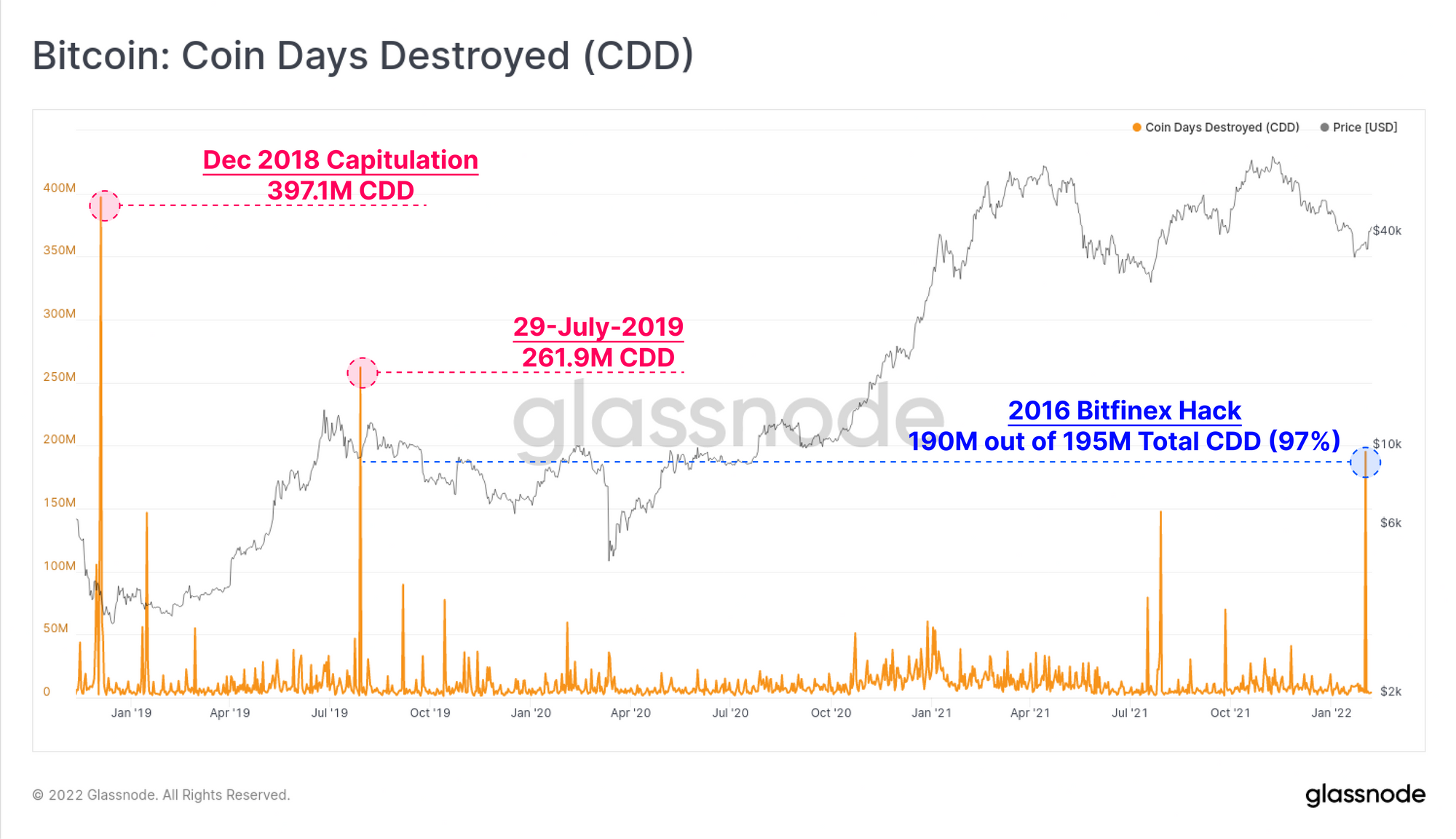 Coin-days destroyed also spiked to multi-year highs with a total of 195M coin-days destroyed, of which 190M (97%) are associated with the Bitfinex wallets.