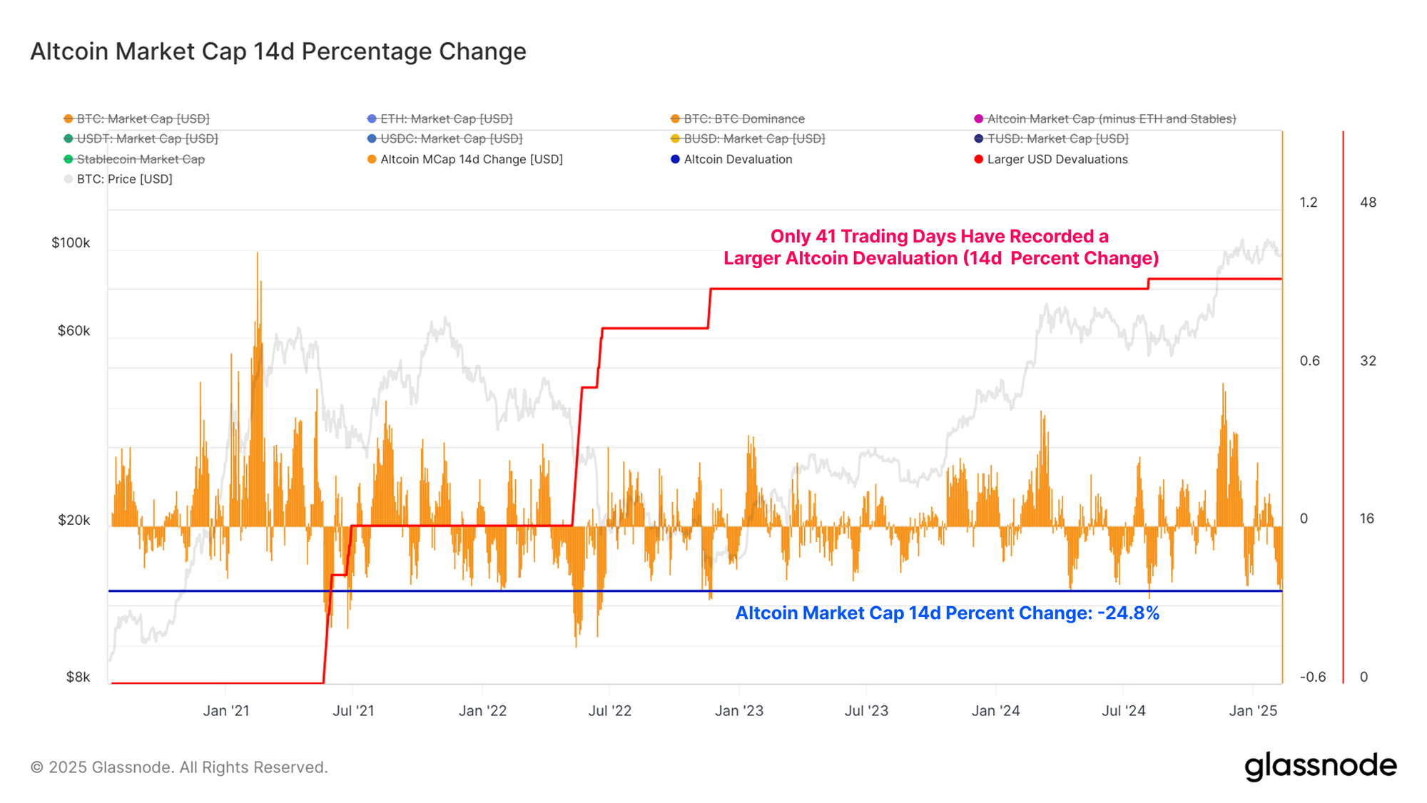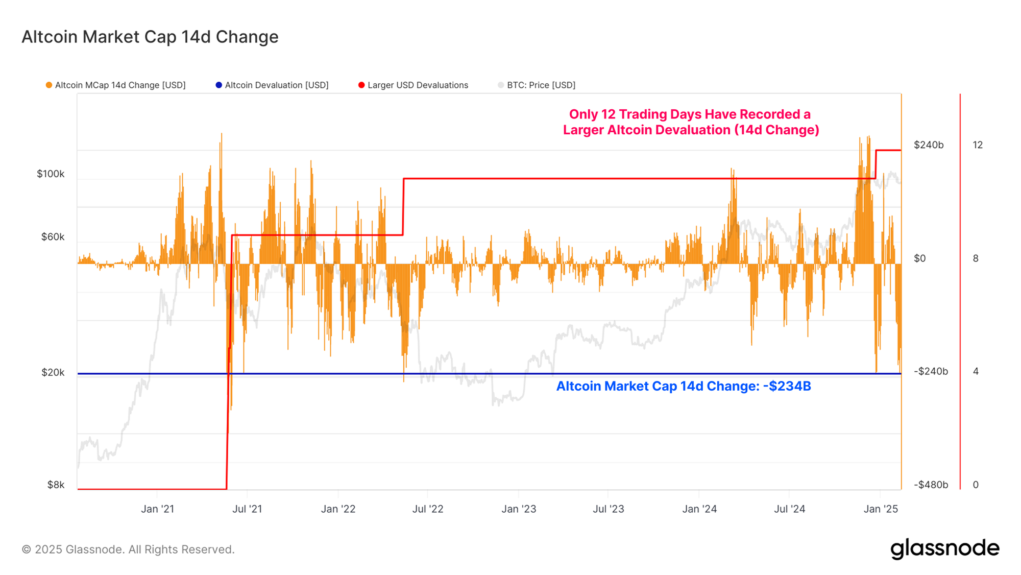 We can evaluate the magnitude of the drawdown by assessing the 14d change in the global altcoin market cap. Over the last fortnight, the altcoin market cap declined by $234B, with a small handful of events days recording a larger absolute drawdown.
