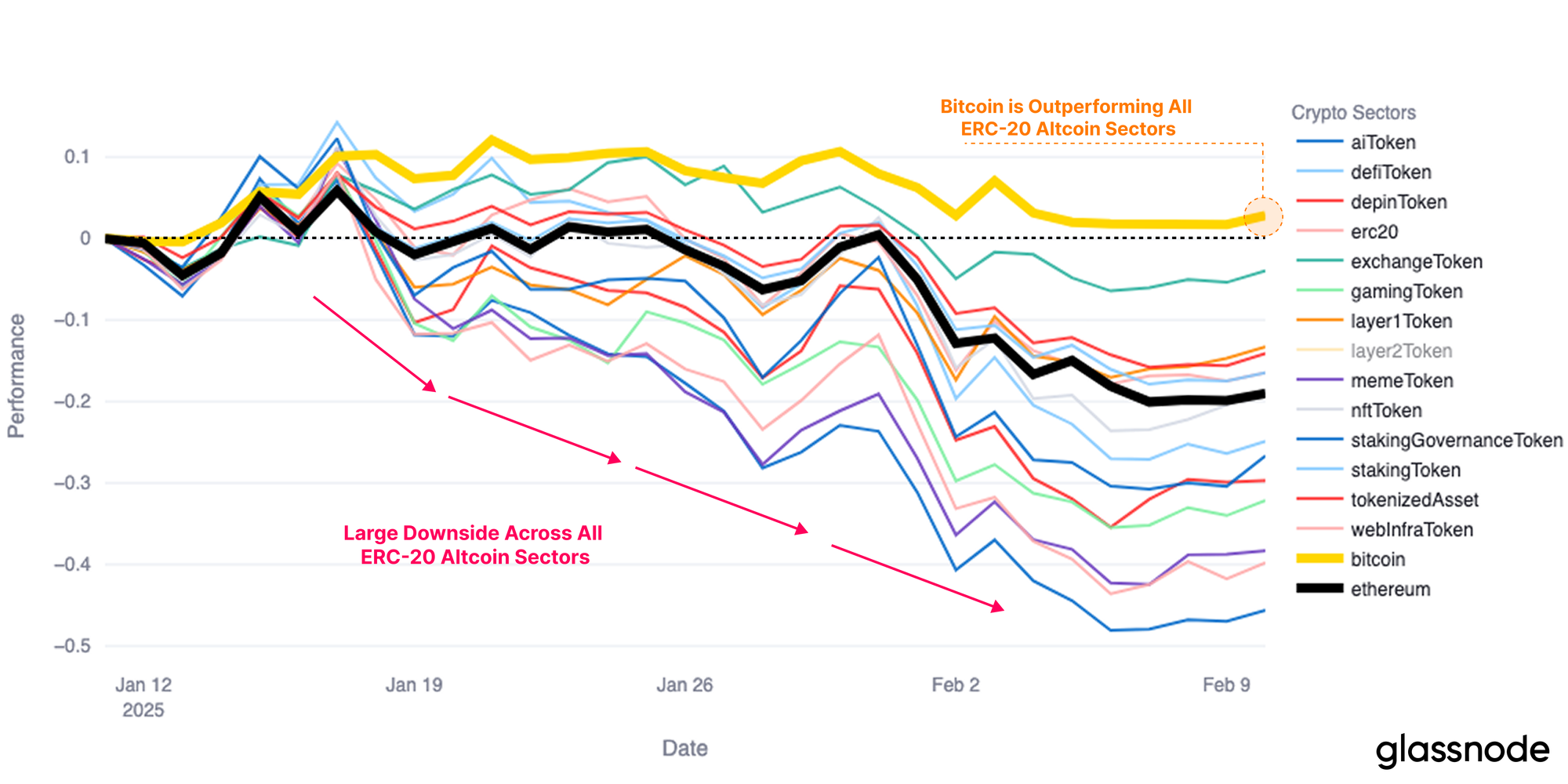 In contrast, the Altcoin sector has undergone a broad sell-off and failed to find firm footing. The majority of tokens have experienced a highly correlated downside sell-off, with few sectors spared from the damage.