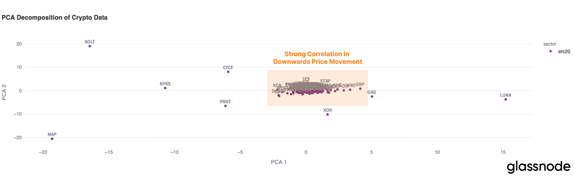 We can observe that the majority of ERC-20 tokens are densely clustered, highlighting that a wide swathe of altcoins experienced the same broad-based sell-off, with a distinct lack of idiosyncratic behavior between different sectors.