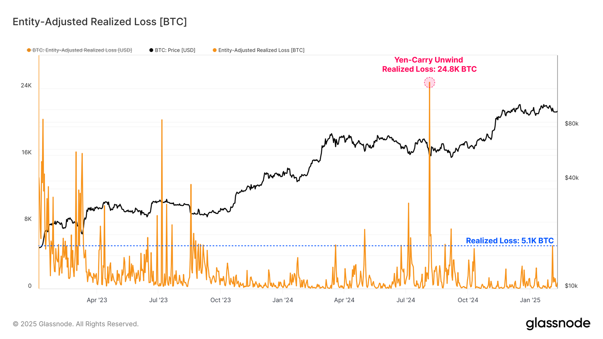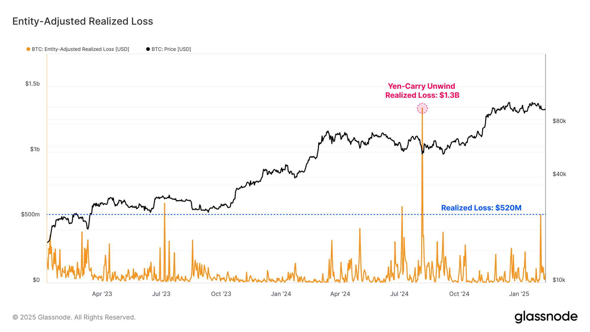 Alternatively, the comparatively price-sensitive Short-Term Holders tend to realize heavy losses during drawdowns within both bull and bear markets. Short-Term Holder entity-adjusted realized losses totalled $520M this week, which is a similar magnitude to pullbacks throughout the 2024-25 cycle thus far.