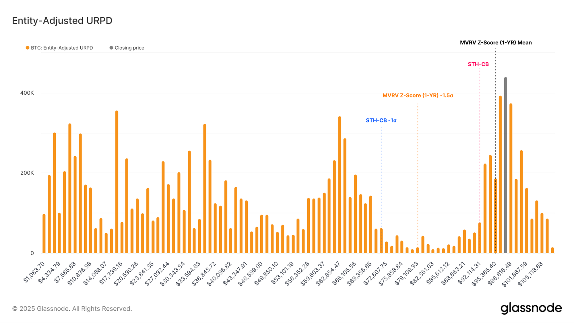 The importance of defending the STH cost basis and the MVRV 1Yr Z-Score pricing regions becomes increasingly apparent when overlaying the price traces onto the URPD volume profile. A significant volume air-pocket can be seen below these levels, where very few coins changed hands in that price range.
