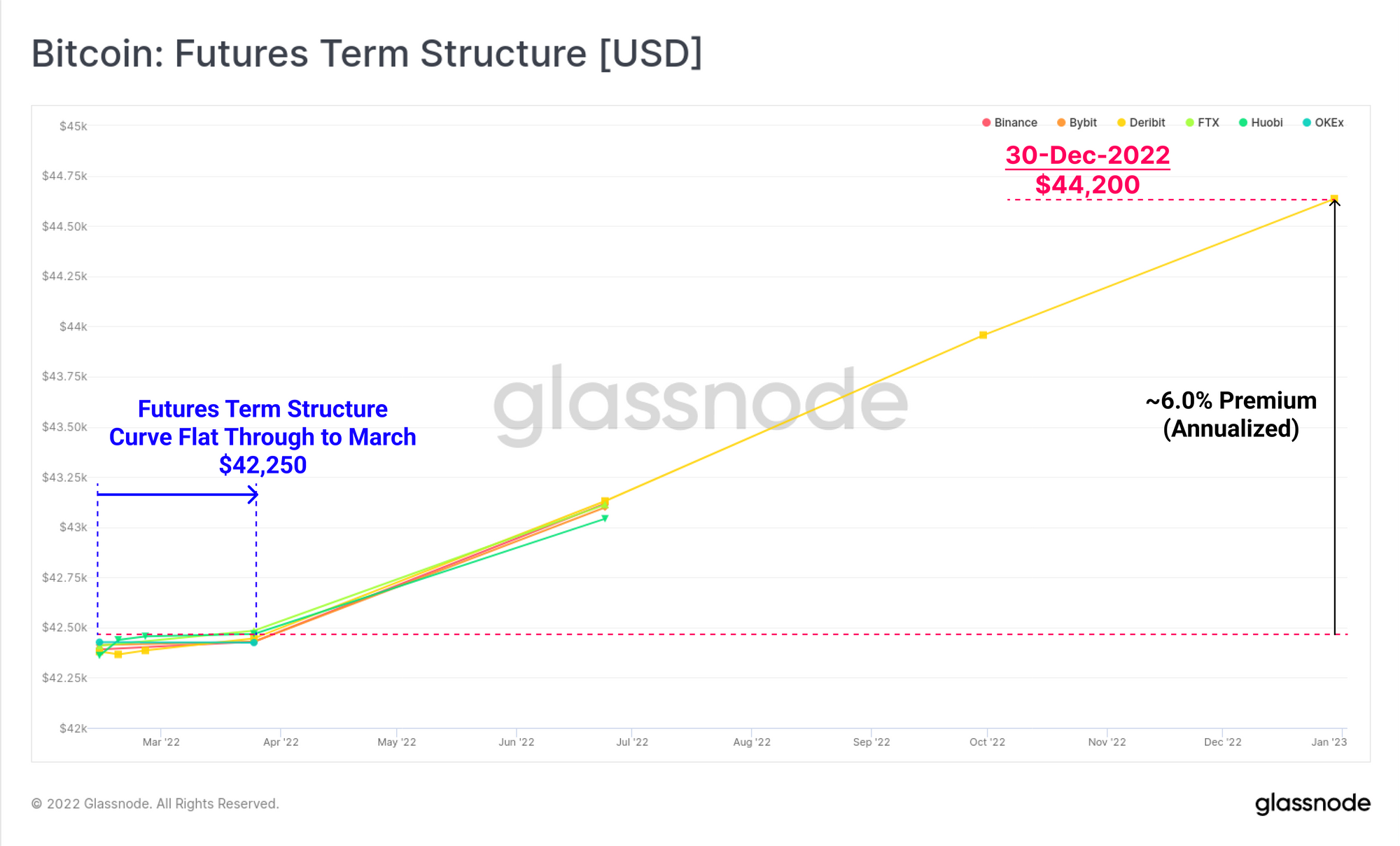 As Bitcoin derivative markets mature and liquidity deepens, we can draw increasingly useful information from futures and options pricing. Across all of the exchanges we track, the futures term structure has flattened out through to March, coincident with the expected rate hikes proposed by the Federal Reserve. This speaks to a clear investor uncertainty regarding the wider economic impact of a tighter US dollar, given the preceding decades of loose monetary policy.