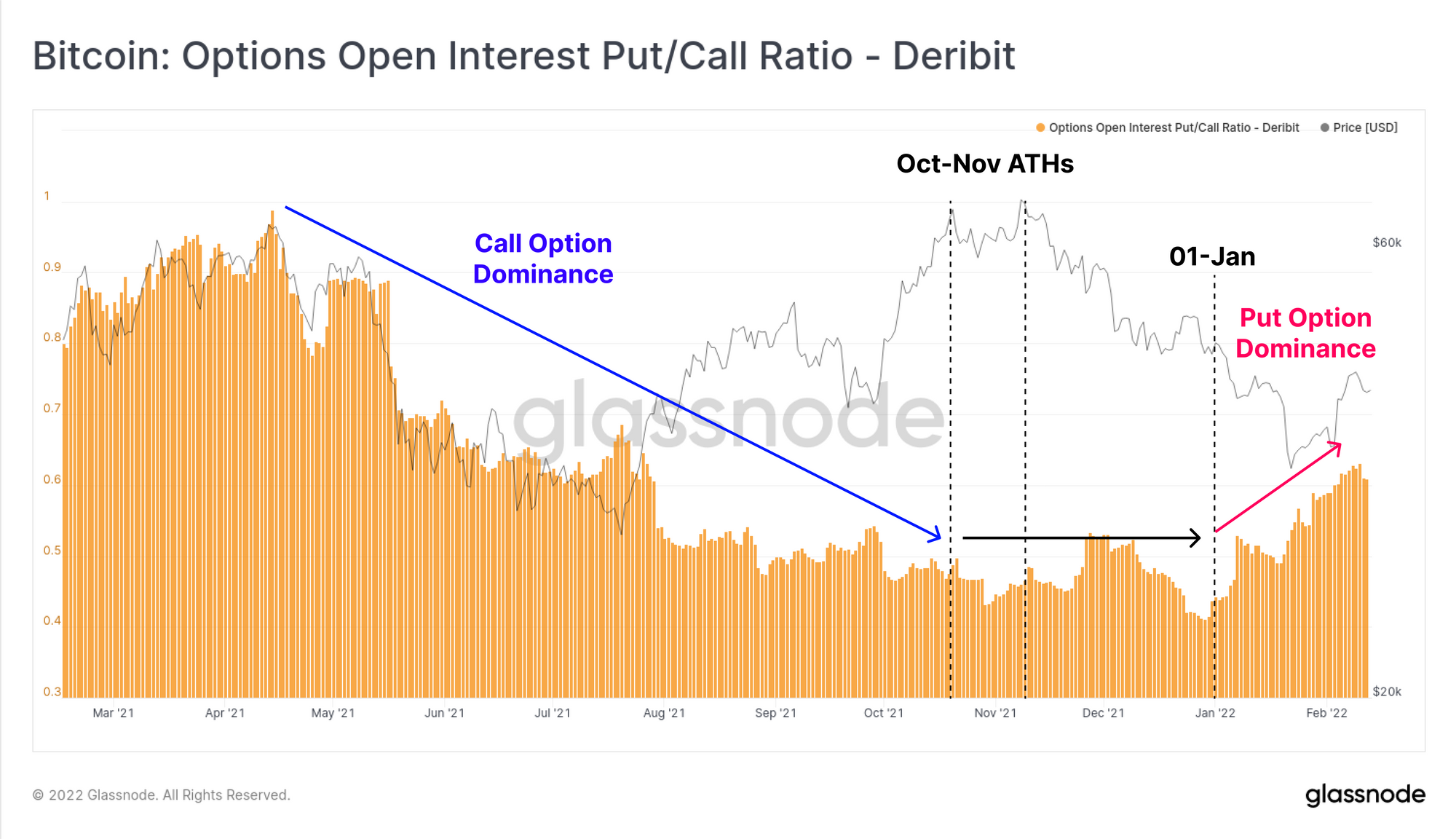 We can also see a strong preference for put option protection with the Put/Call open interest ratio continuing to climb. The transition from traders favouring speculative call options, and into protective put options is quite clear following the October and November 2021 ATHs, indicative of a new regime of investor sentiment.