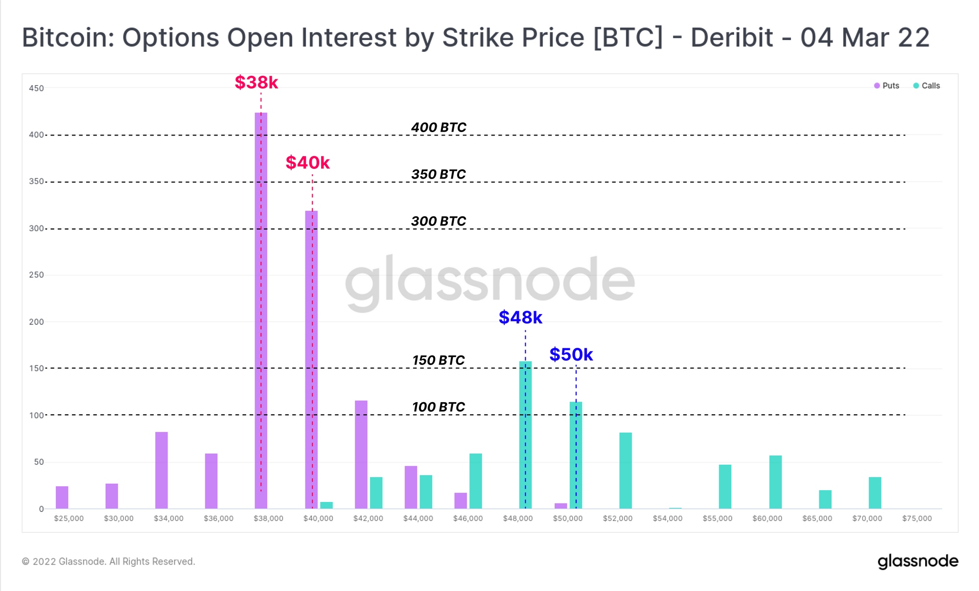 Higher put/call dominance is also apparent when looking at the open interest distribution for the 4-March contract. The market has a clear preference for puts with a strike between $38k and $40k, carrying more than 2.5x the open interest of the highest volume call option strikes, between $48k and $50k.