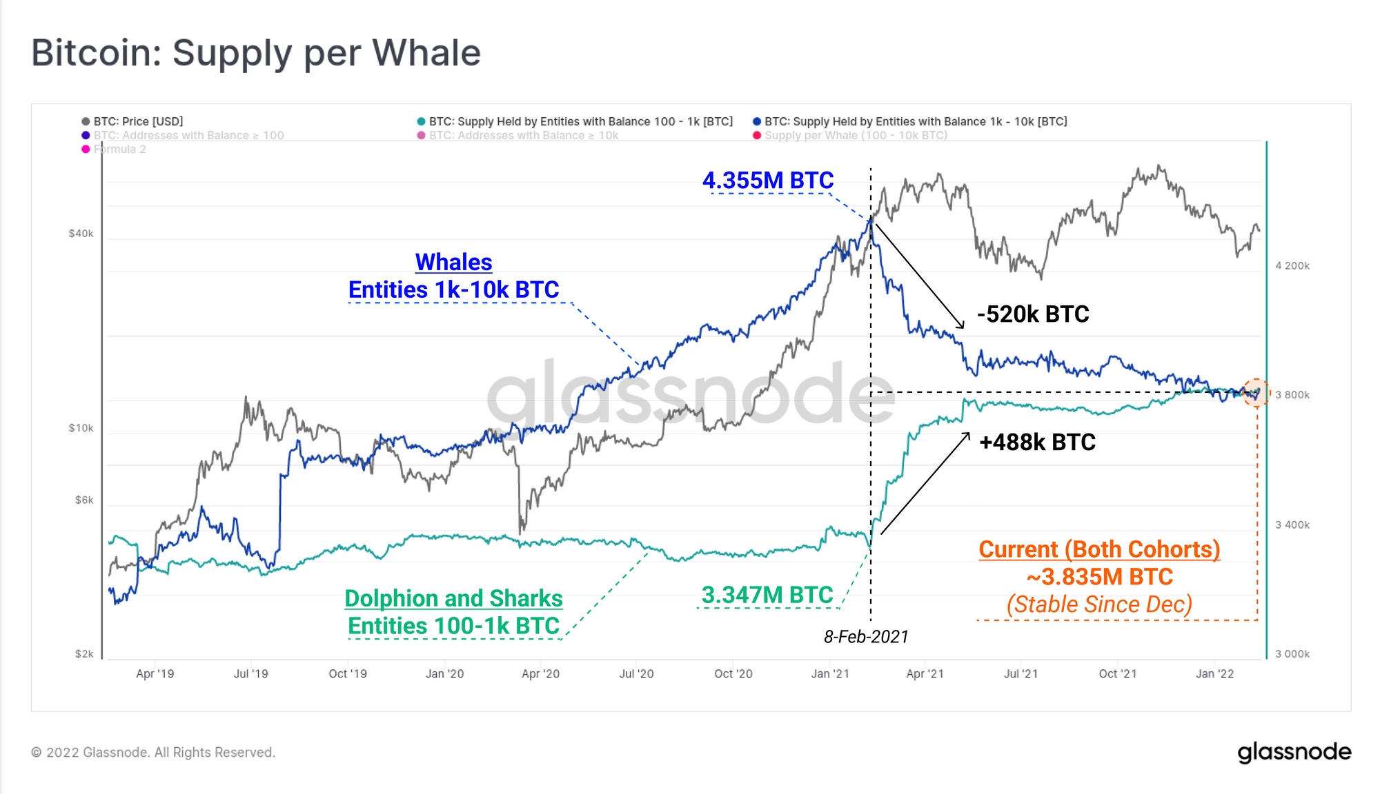What we can see is an almost equal and opposite change in total supply held in these two cohorts throughout 2021. As the supply held by 1k-10k cohorts declined by 520k BTC, the supply held by 100-1k cohorts increased by 488k BTC. Finer grained analysis would reveal whether these coins were bought, sold, or simply reconfigured into a greater number of smaller value UTXOs.