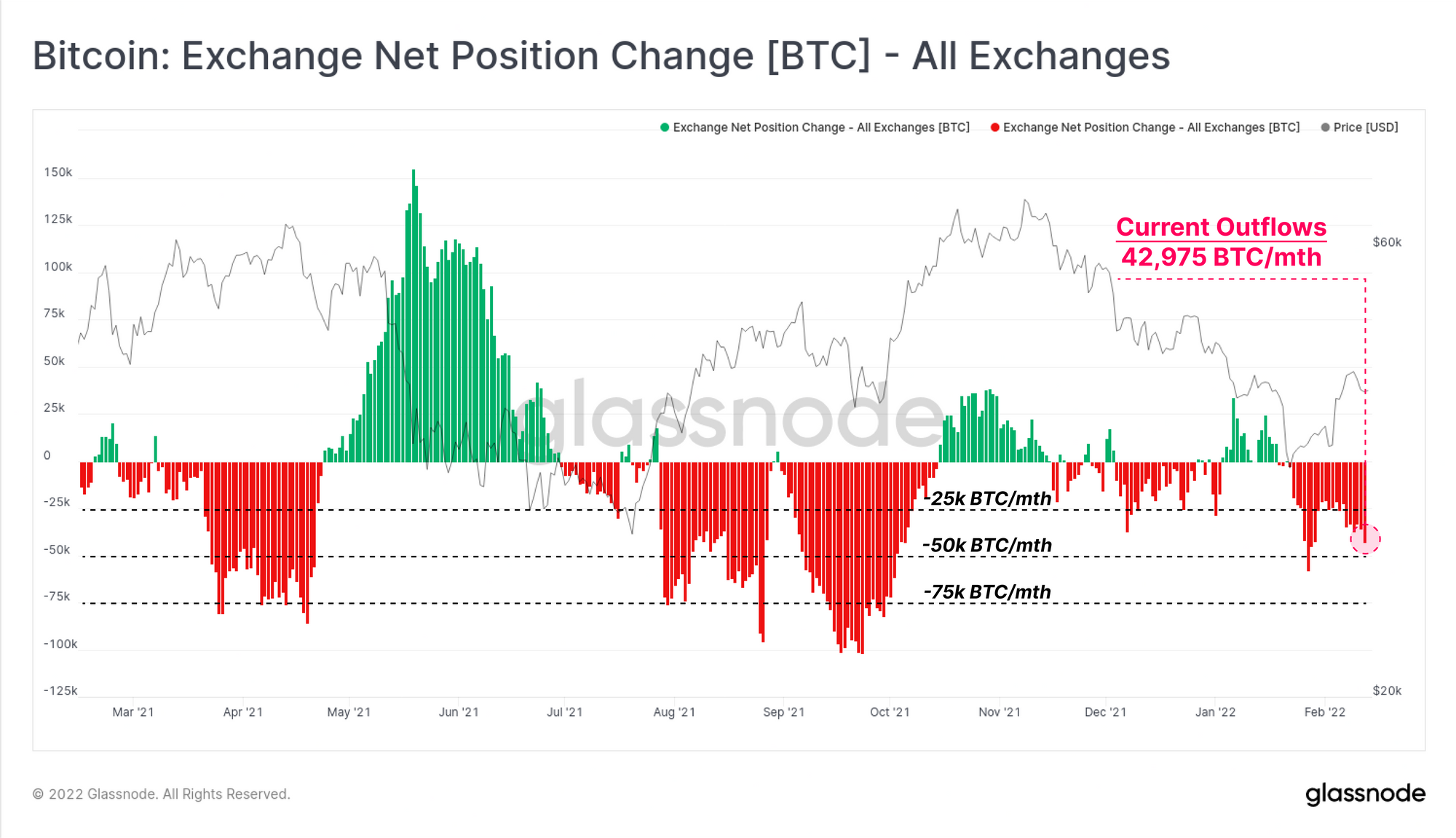 In aggregate however, through the course of 2021-22, this leaves a net of -32k BTC that migrated out of these wallet cohorts. This is arguably a small coin volume when spread over a year long process of redistribution, and also relative to the present monthly rate of exchange outflows (42.9k BTC/mth).