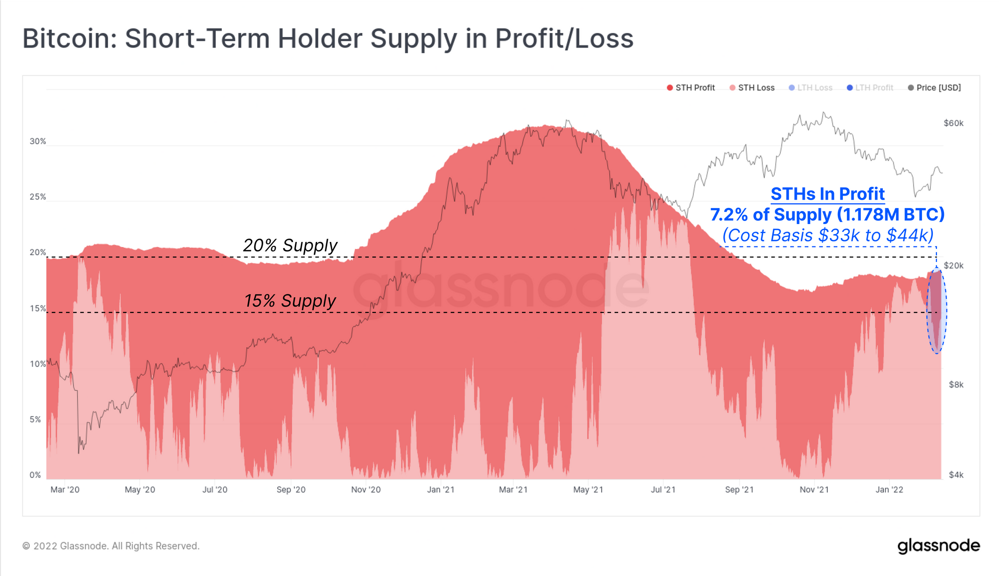 The Short-Term Holder cohort (STHs, coins younger than ~155-days), currently hold 18.85% of the supply that is outside of exchange reserves (note: LTH supply + STH supply + exchange Balance ~ Circulating supply).