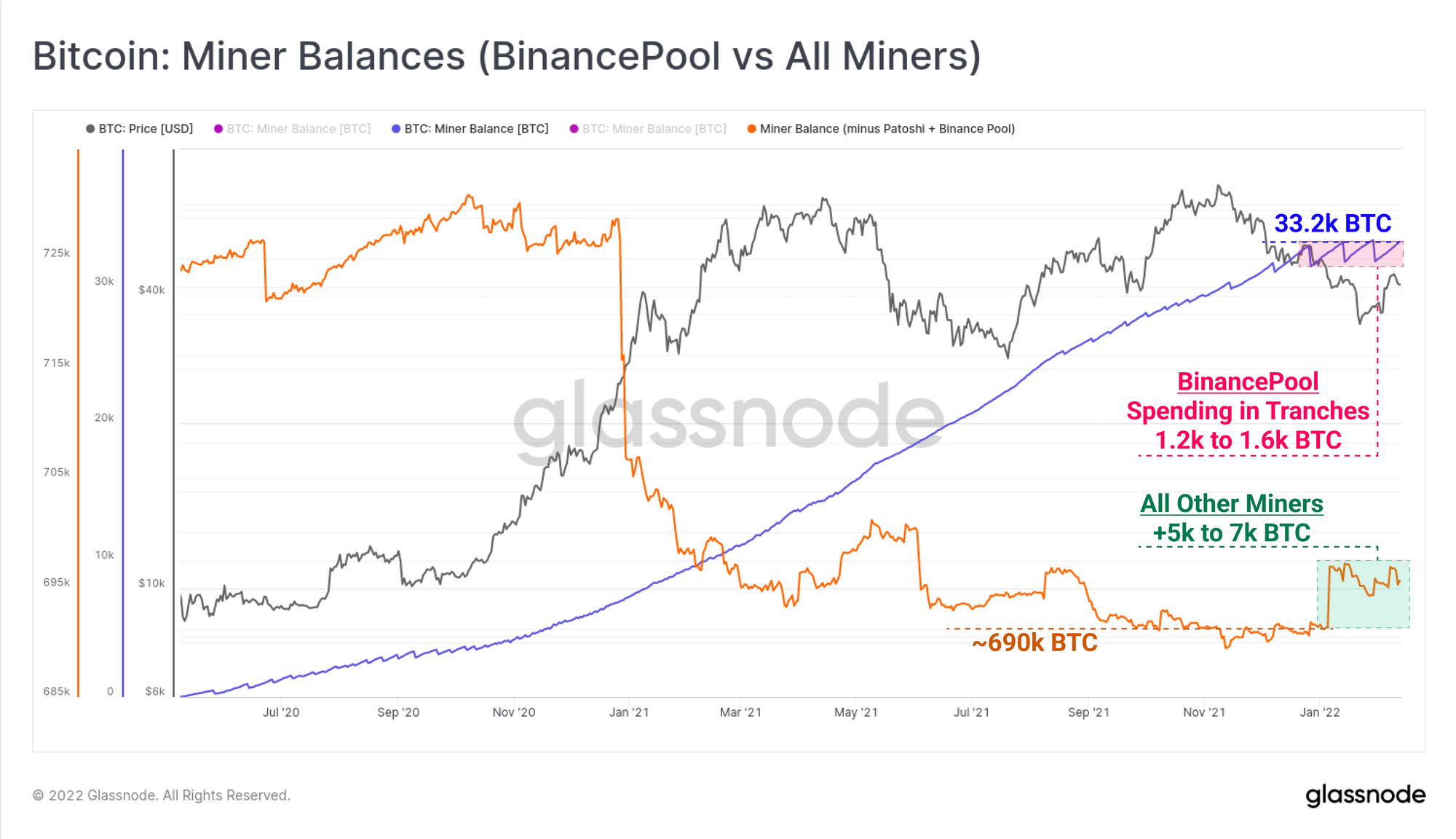 - BinancePool (blue) has been a strong net accumulator of mined coins since mid-2020, having amassed a reserve of 33.2k BTC. However throughout 2022, miners associated with BinancePool have been spending in semi-regular tranches of between 1.2k and 1.6k BTC.