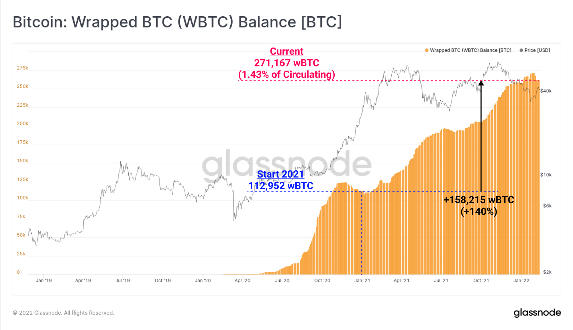 The wrapping of Bitcoin into wBTC for use within the Ethereum ecosystem has been in impressively high demand, having now absorbed 271,167 BTC, over 1.43% of circulating supply. wBTC supply has expanded by 140% since the start of 2021, growing by 158.2k BTC.