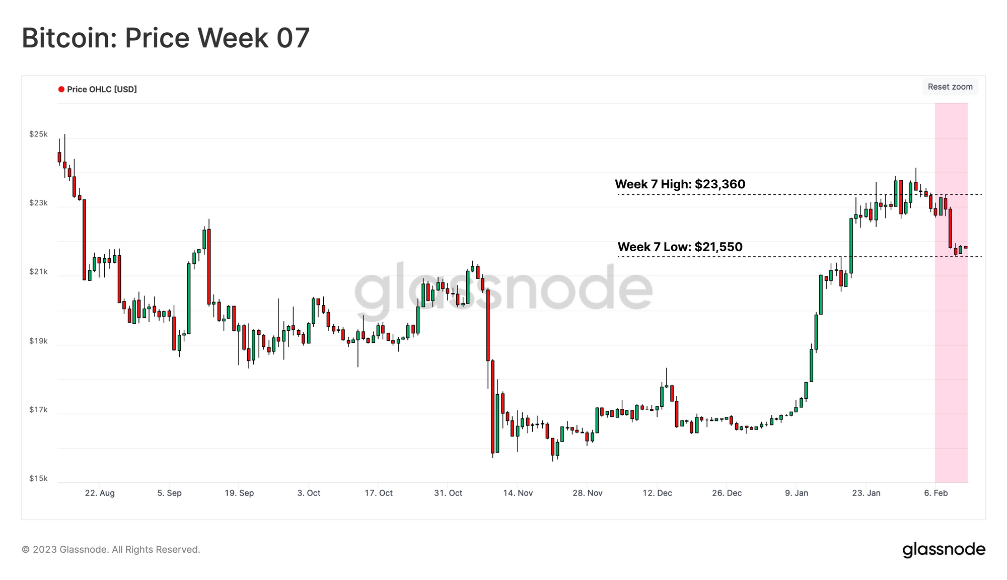The digital asset market has experienced the first significant pullback since the rally throughout January, retracing from a weekly high of $23.3k to a low of $21.5k. This comes alongside significant regulatory news coming out of the US, such as the SEC issuing a fine to Kraken for their staking services, legal action by the SEC against Paxos for issuing the BUSD stablecoin, as well as several actions against crypto banking partners and payment providers.