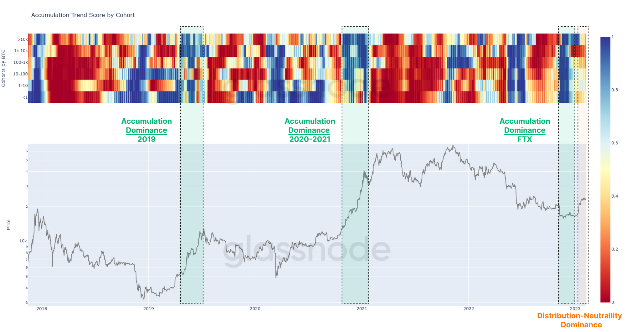We can further inspect the components of the Accumulation Trend Score, to provide granular analysis of various wallet balance cohorts. We observe a shift in the aggregated behavior of investors across all cohorts, from net Accumulation (post FTX capitulation) 🟩 to Distribution-Neutral ** 🟧 during recent weeks.