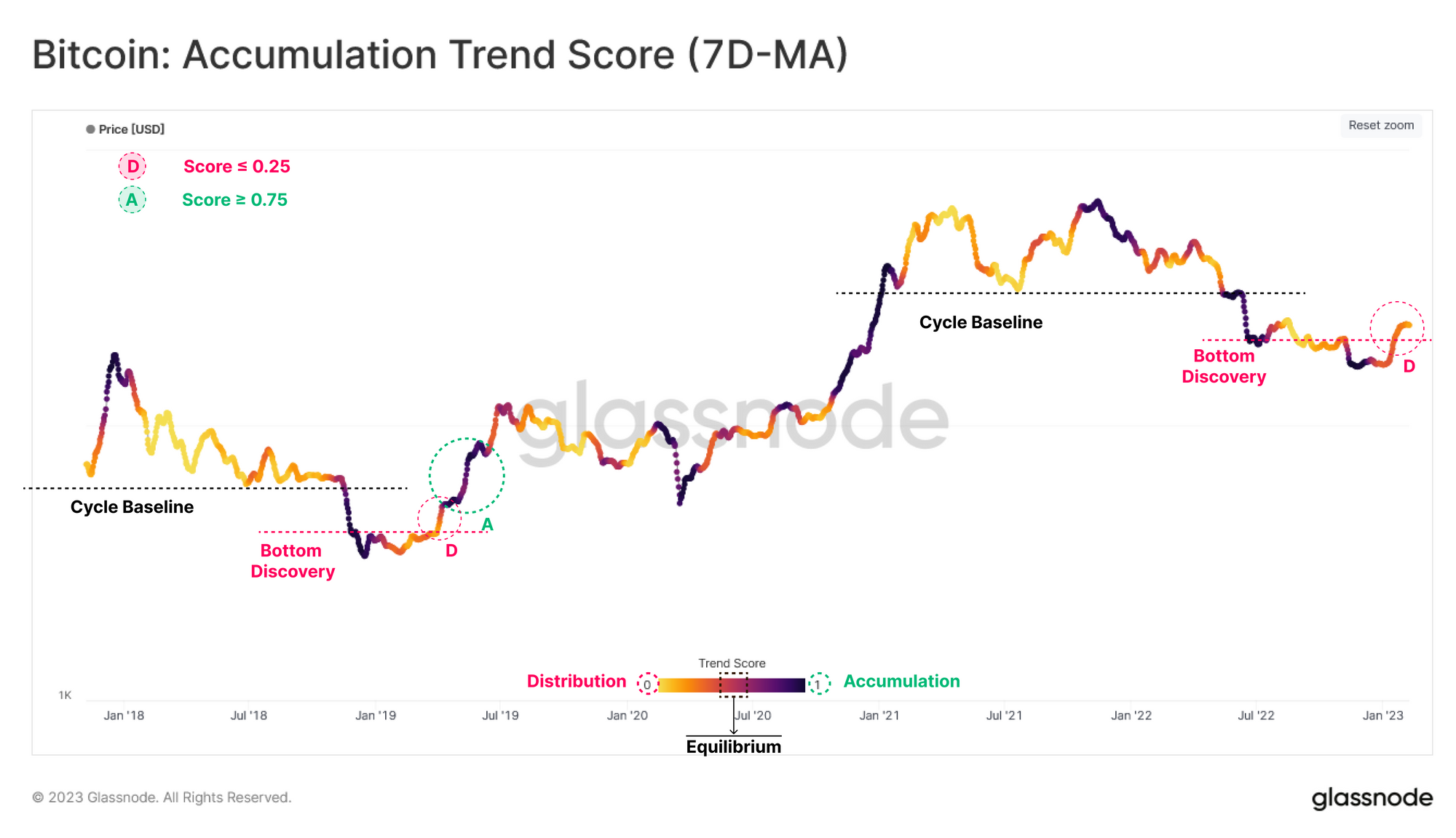Accordingly, the sustainability of the prevailing rally will have some dependence on whether these larger entities continue to accumulate (🟢 A), resulting in the Accumulation Trend Score advancing back towards a value of 1.0.