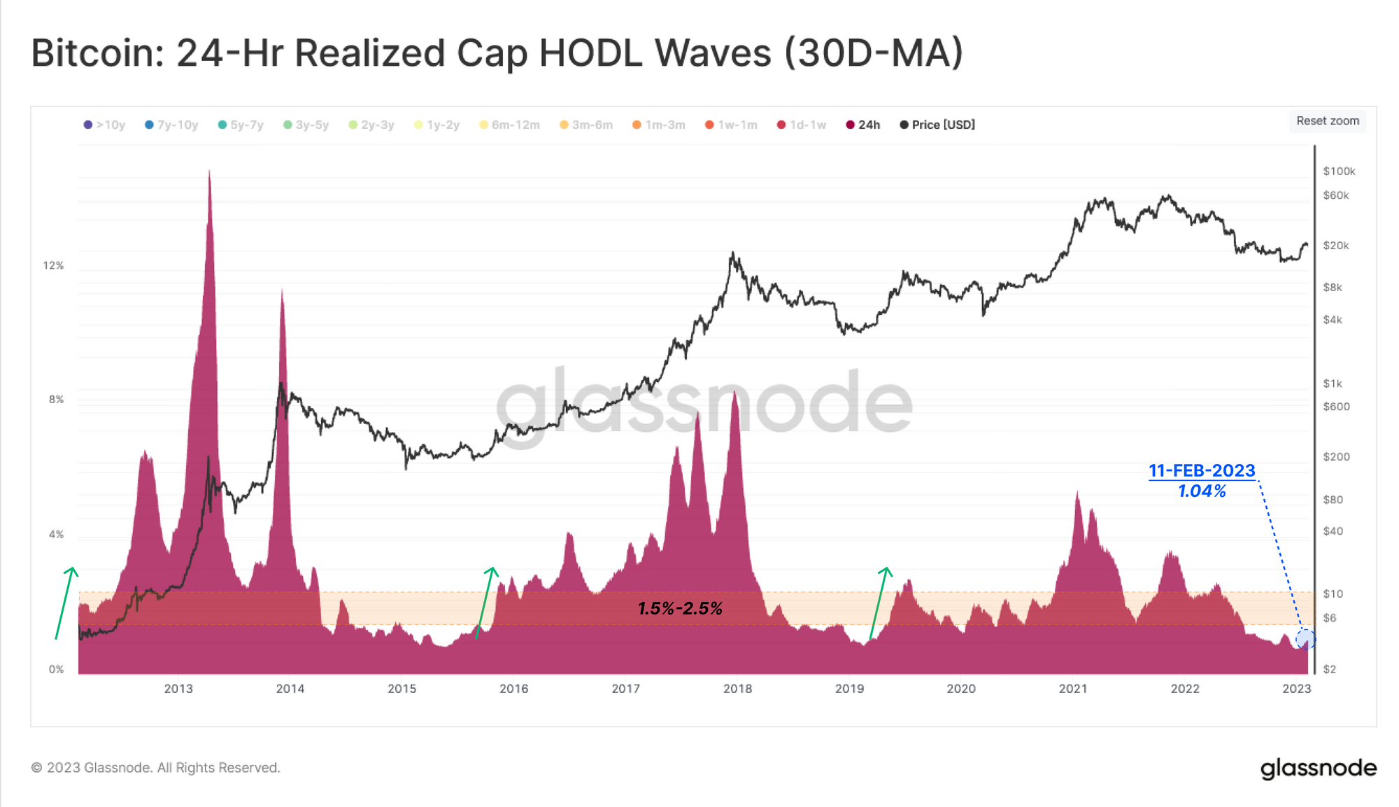 The magnitude of wealth moving on a daily basis can be tracked via the 1-day band of Realized Cap HOLD Waves. This metric captures the relative share of USD wealth changing hand on a daily basis.