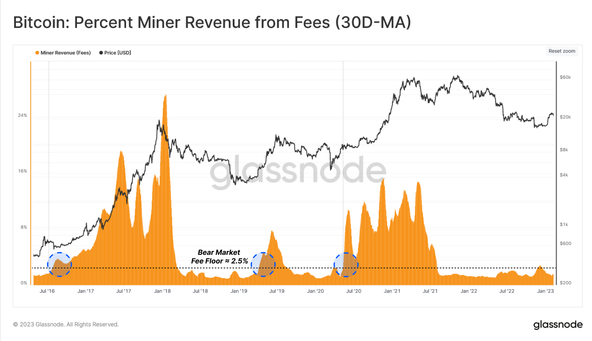 Looking at the monthly average of Miners Revenue from Fees, it is evident that this indicator has not yet surpassed the bear market fee floor rate (2.5%) 🔵 for a notable period of time.