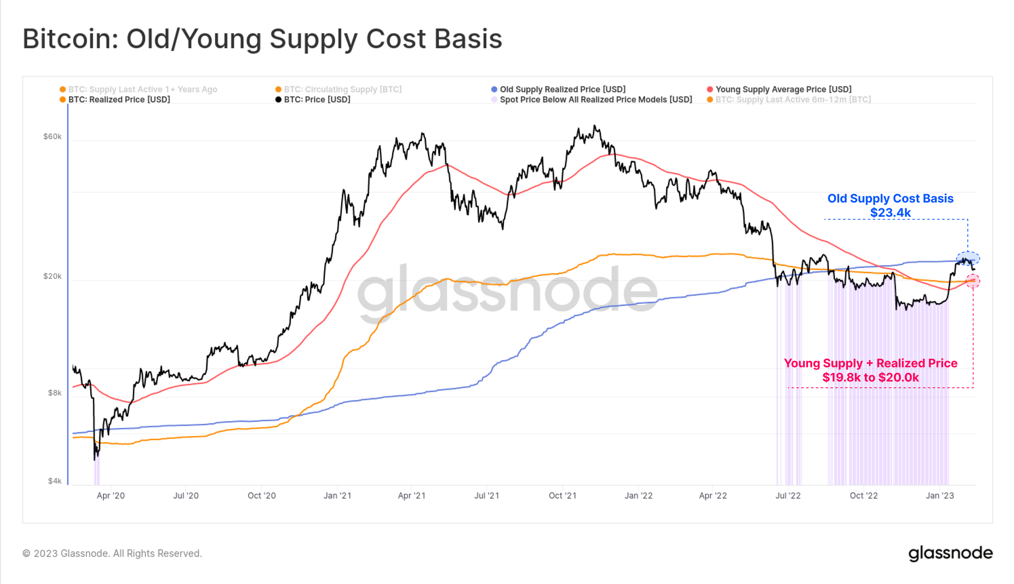 In general, after the Bitcoin market retraces from an extreme level (such as macro tops or bottoms), the behavior of the most recently active investors tends to become a dominant factor. The chart below shows that price stalled near the cost basis of Old Supply $23.4k (> 6-months 🔵), and has both the Realized Price (🟠) and Young Supply (< 6-months 🔴) sitting below at $19.8k to $20.0k.